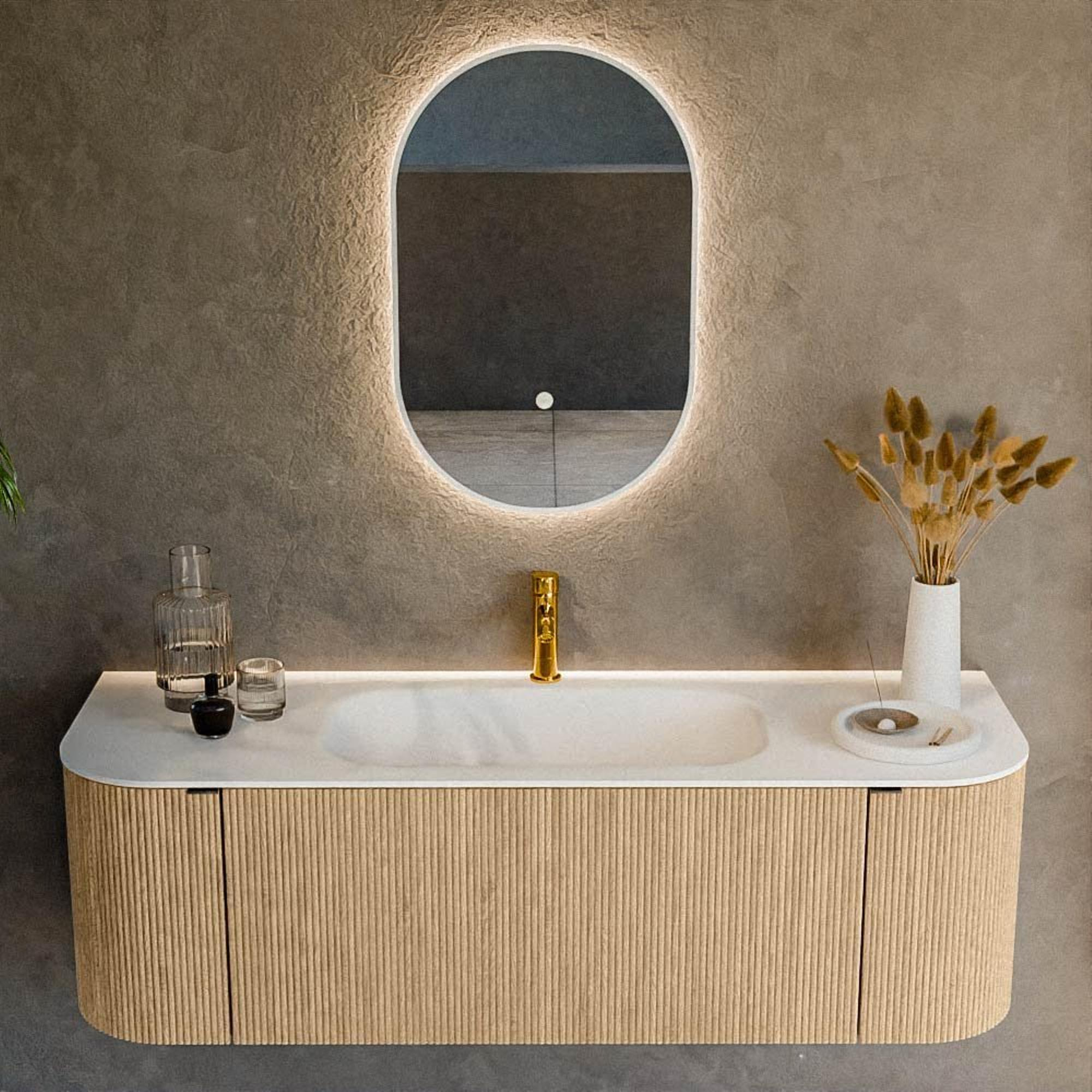 Het ultieme badmeubel dat je badkamer transformeert tot een oase van verfijning. Met zijn halfronde, verticale stroken van massief eiken, verkrijgbaar in de kleuren Oak en Walnut, straalt KURVE vakmanschap uit in elk detail. De zachte rondingen en slim ontworpen deurtjes, elk 40cm hoog, nodigen uit tot gebruik, terwijl de ruimte binnenin optimaal benut wordt dankzij de royale lade van dezelfde hoogte.