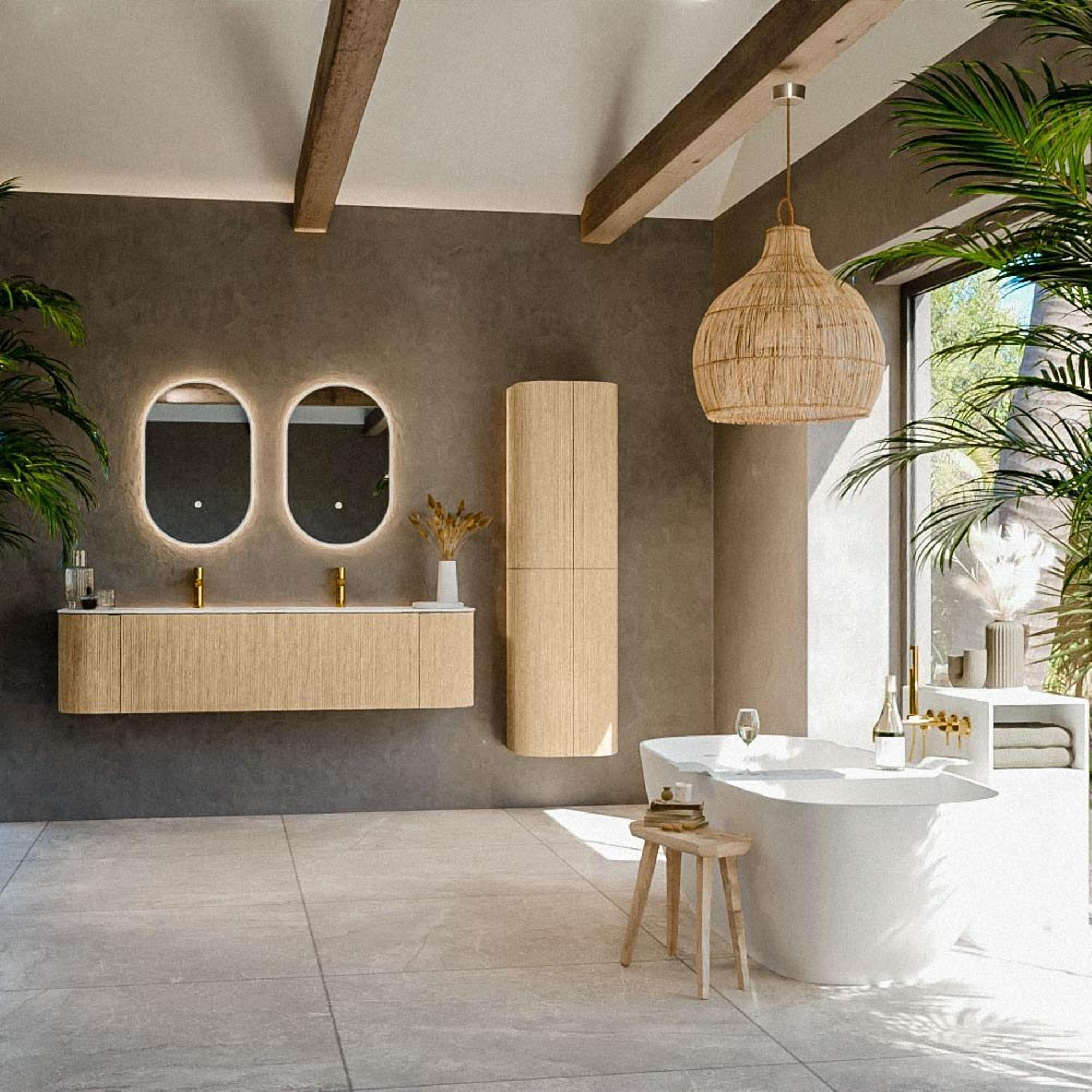 Het ultieme badmeubel dat je badkamer transformeert tot een oase van verfijning. Met zijn halfronde, verticale stroken van massief eiken, verkrijgbaar in de kleuren Oak en Walnut, straalt KURVE vakmanschap uit in elk detail. De zachte rondingen en slim ontworpen deurtjes, elk 40cm hoog, nodigen uit tot gebruik, terwijl de ruimte binnenin optimaal benut wordt dankzij de royale lade van dezelfde hoogte.