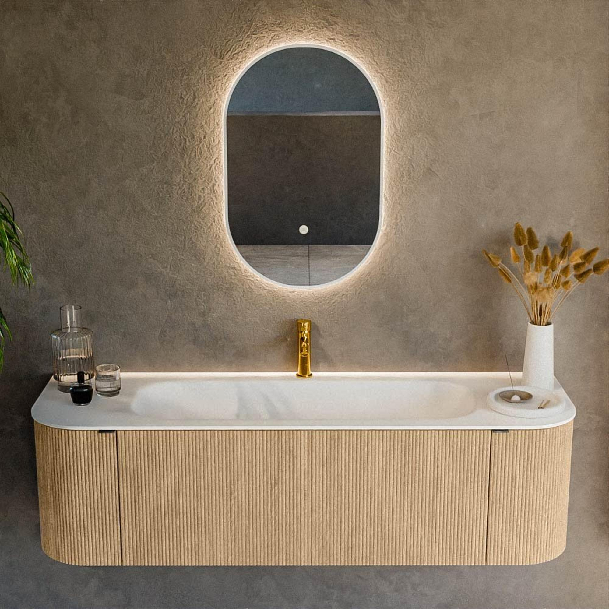 Het ultieme badmeubel dat je badkamer transformeert tot een oase van verfijning. Met zijn halfronde, verticale stroken van massief eiken, verkrijgbaar in de kleuren Oak en Walnut, straalt KURVE vakmanschap uit in elk detail. De zachte rondingen en slim ontworpen deurtjes, elk 40cm hoog, nodigen uit tot gebruik, terwijl de ruimte binnenin optimaal benut wordt dankzij de royale lade van dezelfde hoogte.