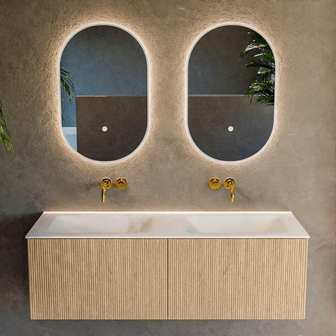 MONDIAZ KURVE 130cm badmeubel kleur Oak met 2 lades. Wastafel CLOUD dubbel zonder kraangat Talc.