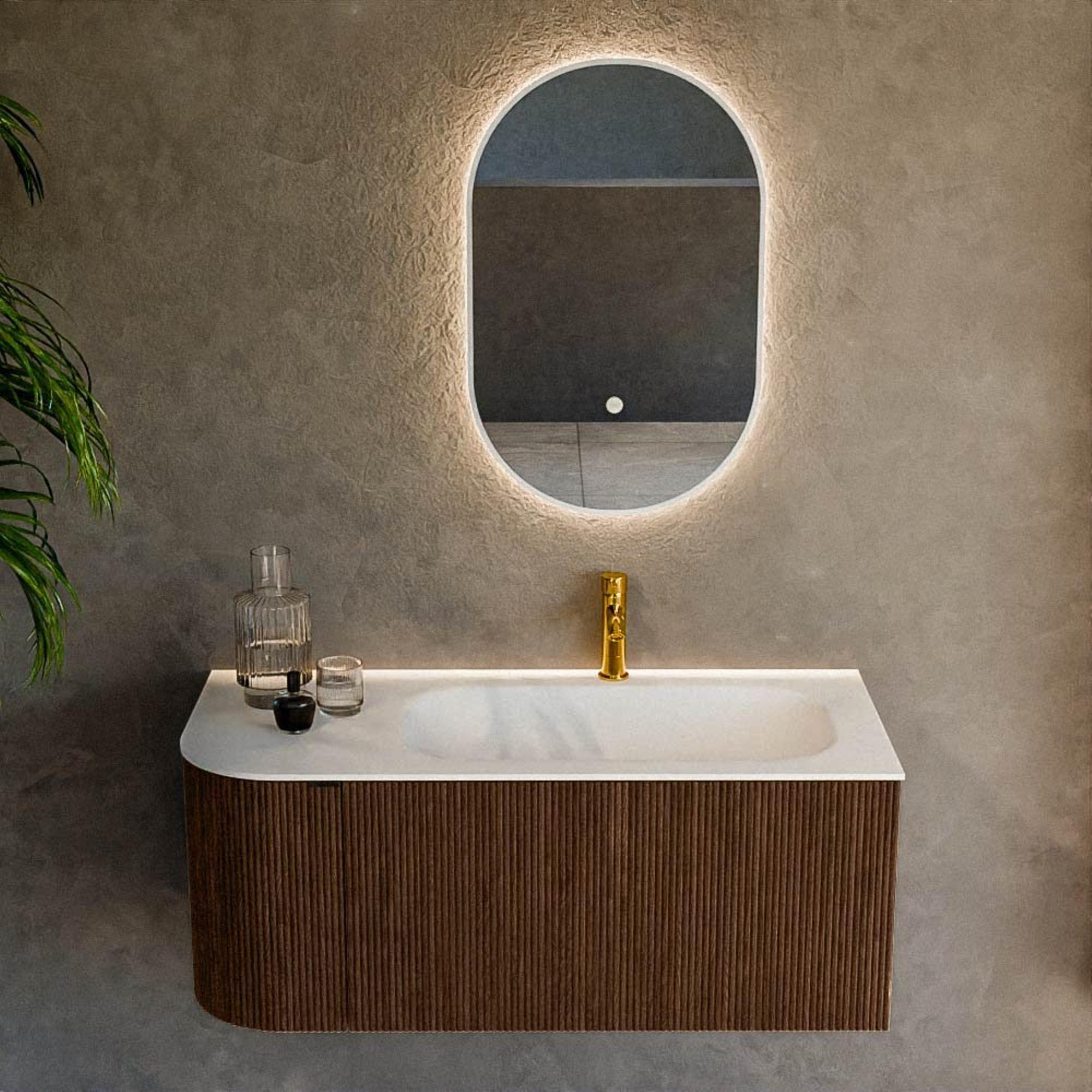 Het ultieme badmeubel dat je badkamer transformeert tot een oase van verfijning. Met zijn halfronde, verticale stroken van massief eiken, verkrijgbaar in de kleuren Oak en Walnut, straalt KURVE vakmanschap uit in elk detail. De zachte rondingen en slim ontworpen deurtjes, elk 40cm hoog, nodigen uit tot gebruik, terwijl de ruimte binnenin optimaal benut wordt dankzij de royale lade van dezelfde hoogte.