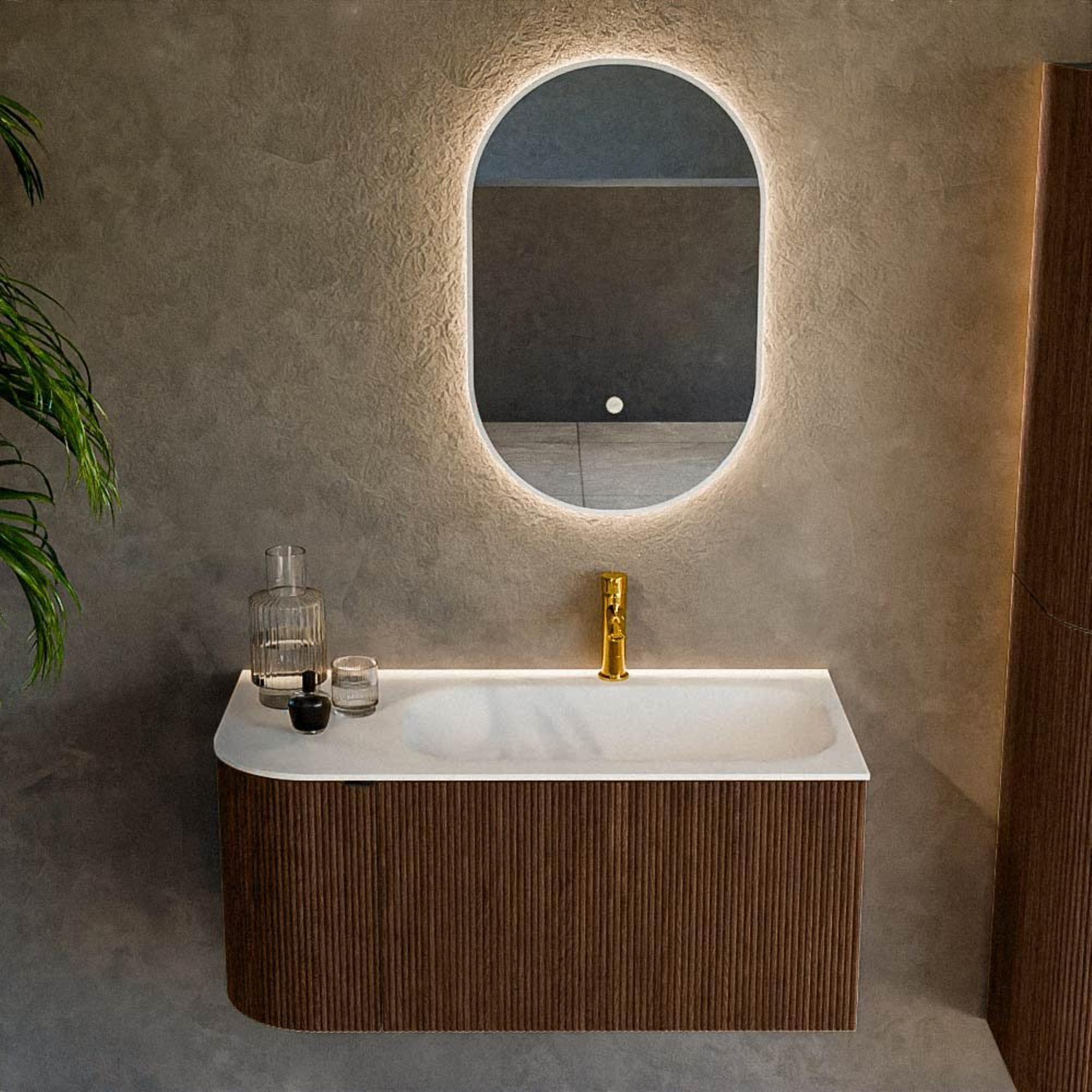 Het ultieme badmeubel dat je badkamer transformeert tot een oase van verfijning. Met zijn halfronde, verticale stroken van massief eiken, verkrijgbaar in de kleuren Oak en Walnut, straalt KURVE vakmanschap uit in elk detail. De zachte rondingen en slim ontworpen deurtjes, elk 40cm hoog, nodigen uit tot gebruik, terwijl de ruimte binnenin optimaal benut wordt dankzij de royale lade van dezelfde hoogte.