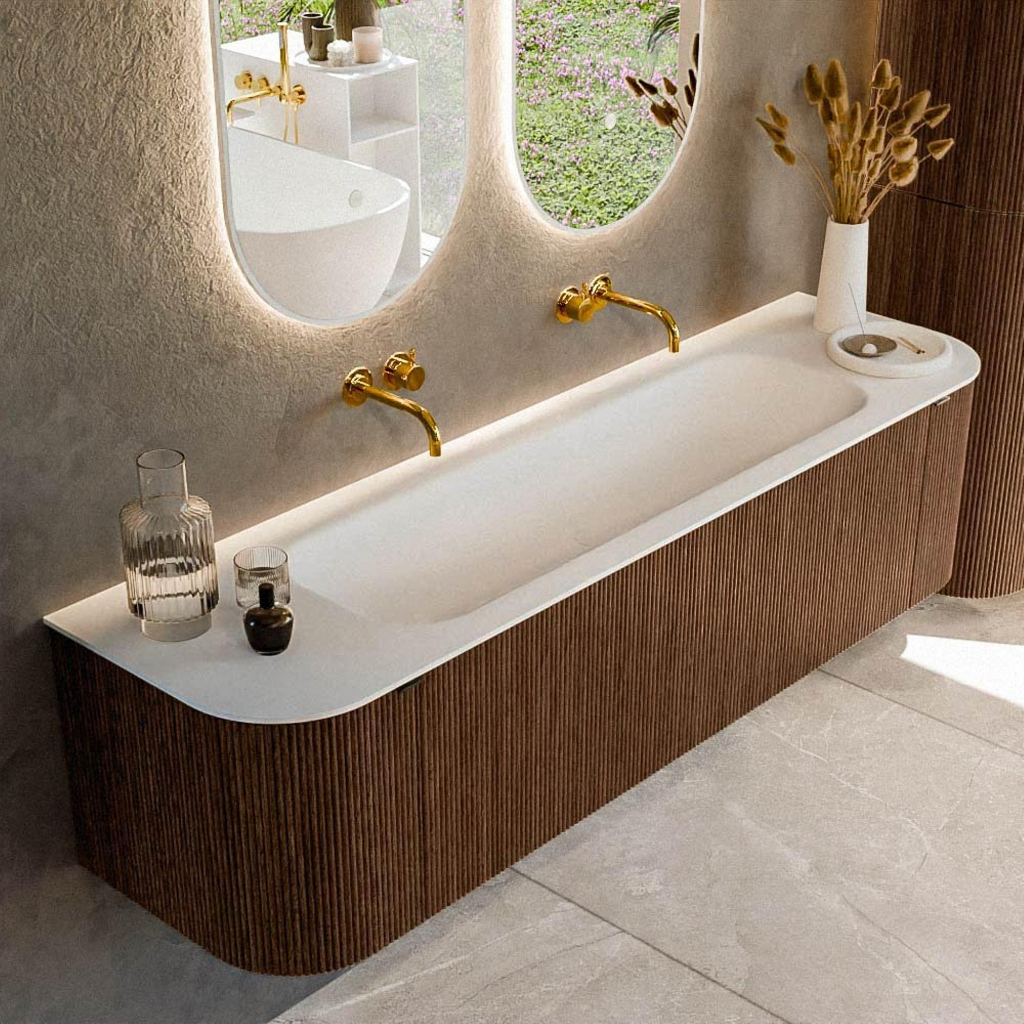 Het ultieme badmeubel dat je badkamer transformeert tot een oase van verfijning. Met zijn halfronde, verticale stroken van massief eiken, verkrijgbaar in de kleuren Oak en Walnut, straalt KURVE vakmanschap uit in elk detail. De zachte rondingen en slim ontworpen deurtjes, elk 40cm hoog, nodigen uit tot gebruik, terwijl de ruimte binnenin optimaal benut wordt dankzij de royale lade van dezelfde hoogte.