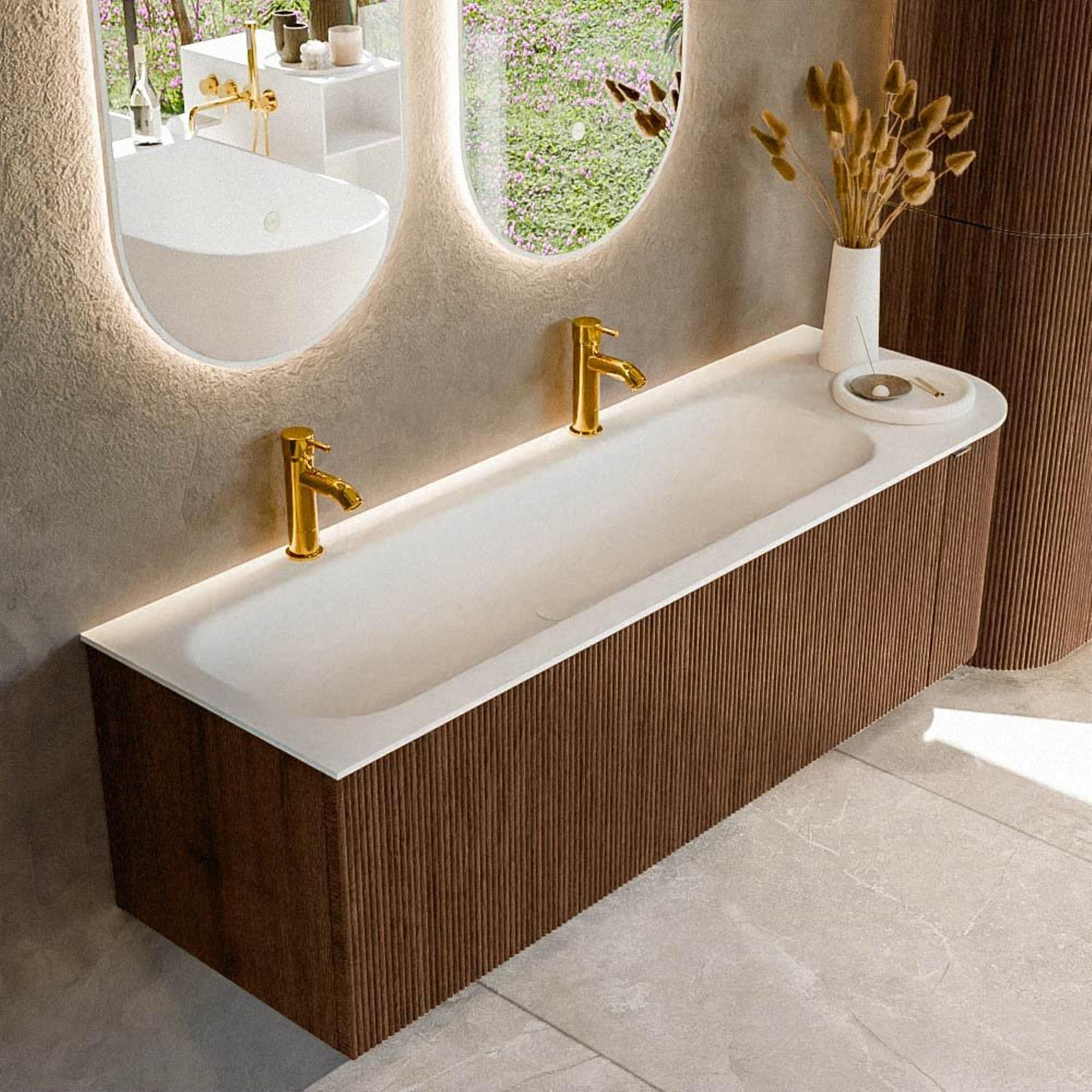 Het ultieme badmeubel dat je badkamer transformeert tot een oase van verfijning. Met zijn halfronde, verticale stroken van massief eiken, verkrijgbaar in de kleuren Oak en Walnut, straalt KURVE vakmanschap uit in elk detail. De zachte rondingen en slim ontworpen deurtjes, elk 40cm hoog, nodigen uit tot gebruik, terwijl de ruimte binnenin optimaal benut wordt dankzij de royale lade van dezelfde hoogte.