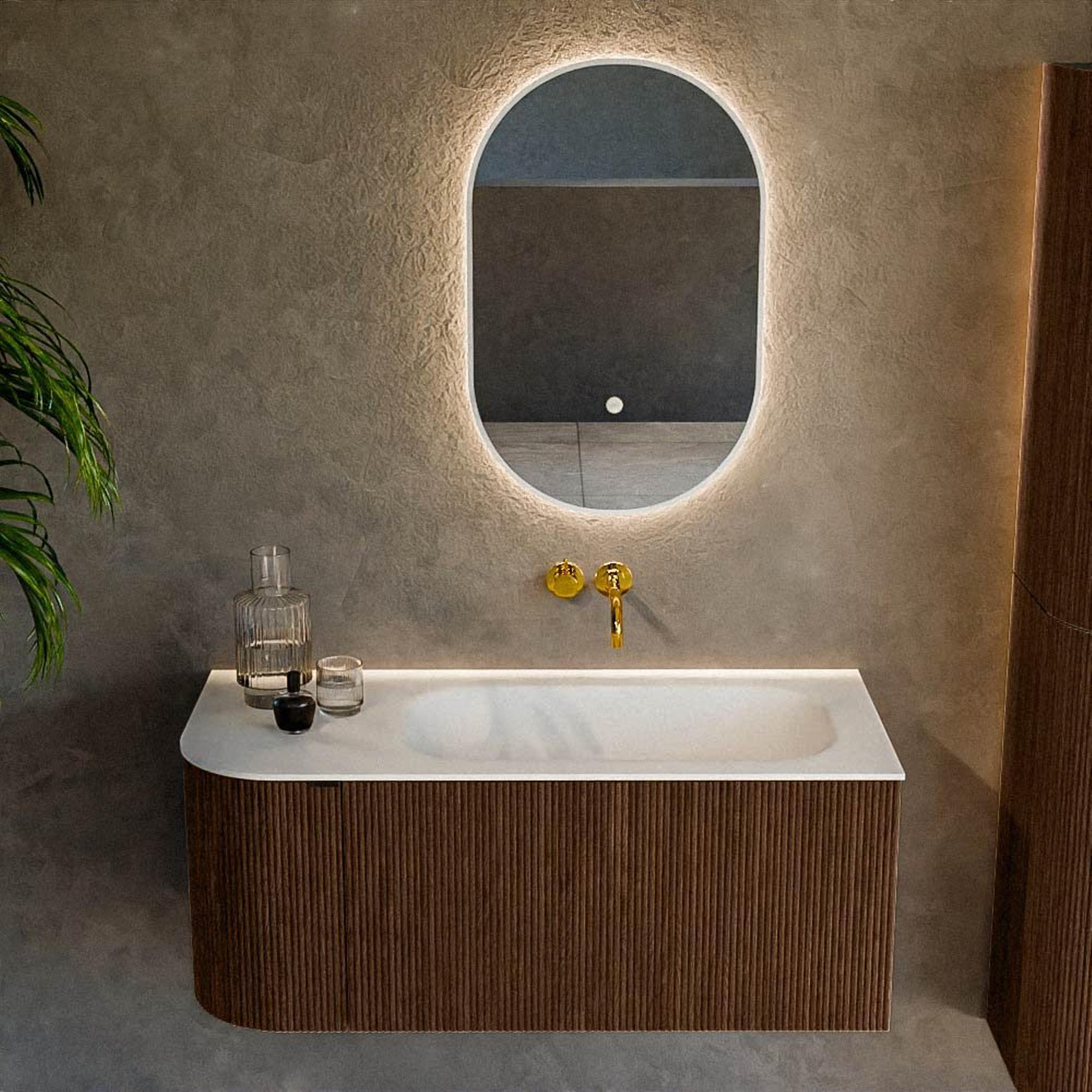 Het ultieme badmeubel dat je badkamer transformeert tot een oase van verfijning. Met zijn halfronde, verticale stroken van massief eiken, verkrijgbaar in de kleuren Oak en Walnut, straalt KURVE vakmanschap uit in elk detail. De zachte rondingen en slim ontworpen deurtjes, elk 40cm hoog, nodigen uit tot gebruik, terwijl de ruimte binnenin optimaal benut wordt dankzij de royale lade van dezelfde hoogte.