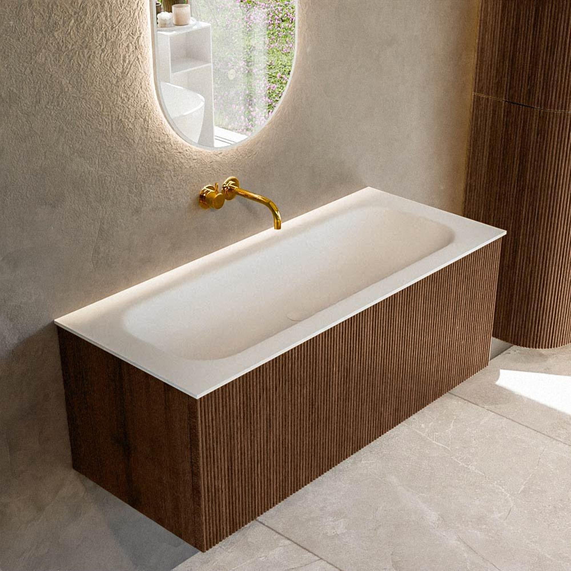 Het ultieme badmeubel dat je badkamer transformeert tot een oase van verfijning. Met zijn halfronde, verticale stroken van massief eiken, verkrijgbaar in de kleuren Oak en Walnut, straalt KURVE vakmanschap uit in elk detail. De zachte rondingen en slim ontworpen deurtjes, elk 40cm hoog, nodigen uit tot gebruik, terwijl de ruimte binnenin optimaal benut wordt dankzij de royale lade van dezelfde hoogte.