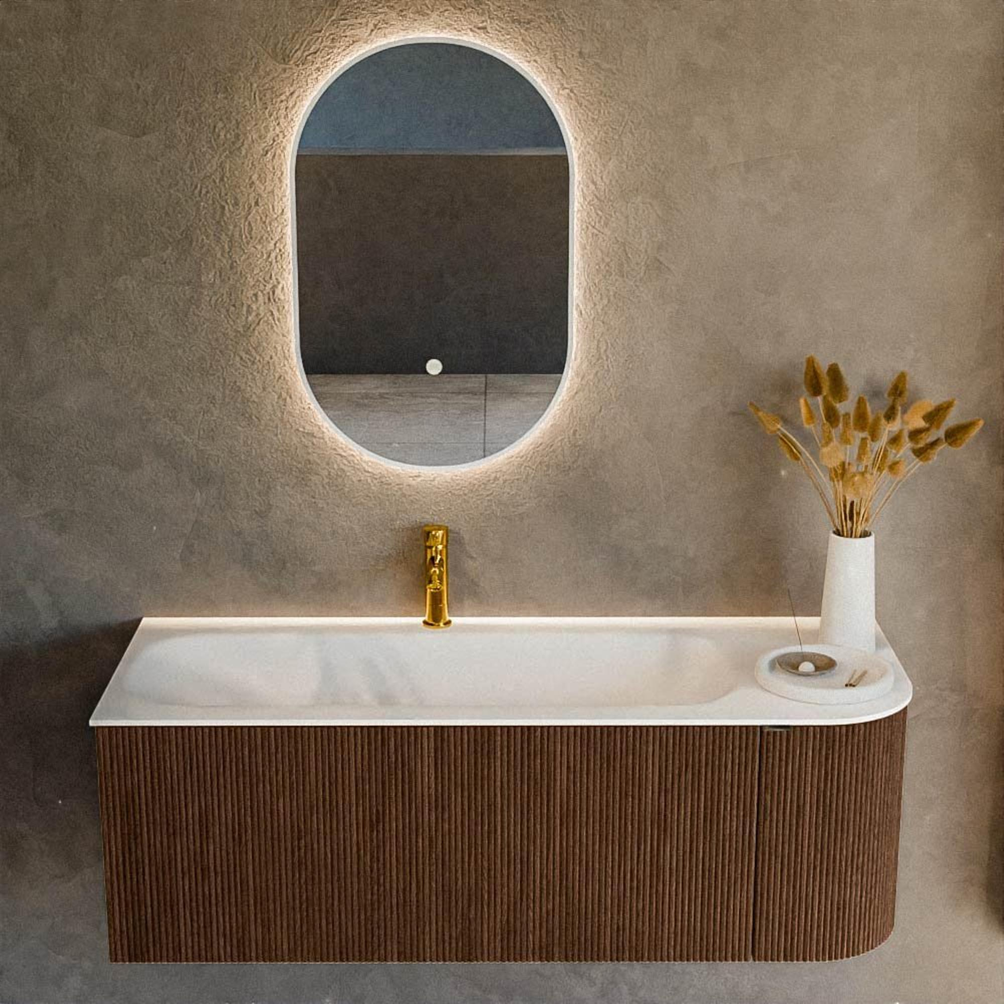 Het ultieme badmeubel dat je badkamer transformeert tot een oase van verfijning. Met zijn halfronde, verticale stroken van massief eiken, verkrijgbaar in de kleuren Oak en Walnut, straalt KURVE vakmanschap uit in elk detail. De zachte rondingen en slim ontworpen deurtjes, elk 40cm hoog, nodigen uit tot gebruik, terwijl de ruimte binnenin optimaal benut wordt dankzij de royale lade van dezelfde hoogte.