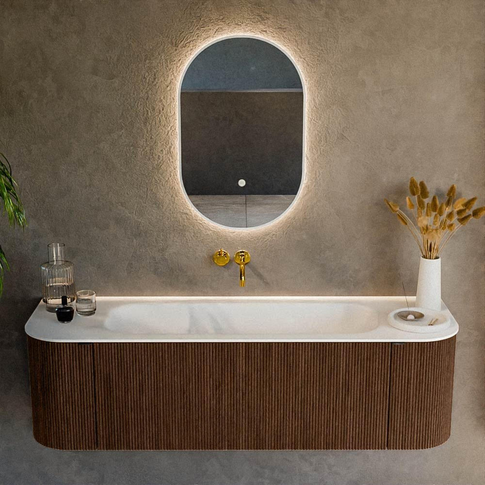 Het ultieme badmeubel dat je badkamer transformeert tot een oase van verfijning. Met zijn halfronde, verticale stroken van massief eiken, verkrijgbaar in de kleuren Oak en Walnut, straalt KURVE vakmanschap uit in elk detail. De zachte rondingen en slim ontworpen deurtjes, elk 40cm hoog, nodigen uit tot gebruik, terwijl de ruimte binnenin optimaal benut wordt dankzij de royale lade van dezelfde hoogte.