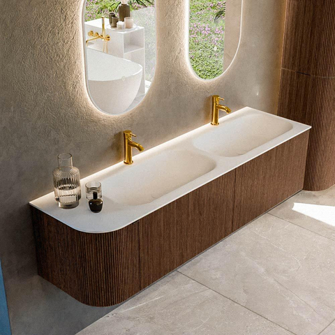 Het ultieme badmeubel dat je badkamer transformeert tot een oase van verfijning. Met zijn halfronde, verticale stroken van massief eiken, verkrijgbaar in de kleuren Oak en Walnut, straalt KURVE vakmanschap uit in elk detail. De zachte rondingen en slim ontworpen deurtjes, elk 40cm hoog, nodigen uit tot gebruik, terwijl de ruimte binnenin optimaal benut wordt dankzij de royale lade van dezelfde hoogte.