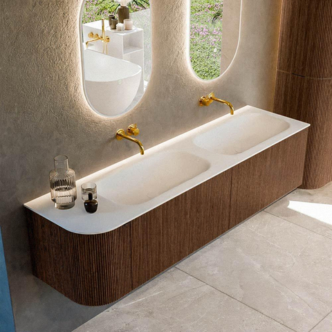 Het ultieme badmeubel dat je badkamer transformeert tot een oase van verfijning. Met zijn halfronde, verticale stroken van massief eiken, verkrijgbaar in de kleuren Oak en Walnut, straalt KURVE vakmanschap uit in elk detail. De zachte rondingen en slim ontworpen deurtjes, elk 40cm hoog, nodigen uit tot gebruik, terwijl de ruimte binnenin optimaal benut wordt dankzij de royale lade van dezelfde hoogte.