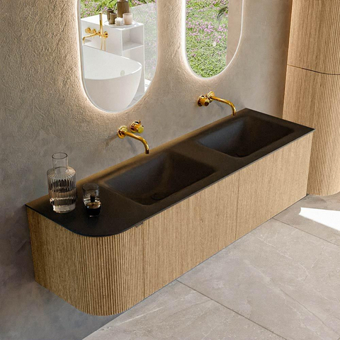 Het ultieme badmeubel dat je badkamer transformeert tot een oase van verfijning. Met zijn halfronde, verticale stroken van massief eiken, verkrijgbaar in de kleuren Oak en Walnut, straalt KURVE vakmanschap uit in elk detail. De zachte rondingen en slim ontworpen deurtjes, elk 40cm hoog, nodigen uit tot gebruik, terwijl de ruimte binnenin optimaal benut wordt dankzij de royale lade van dezelfde hoogte.