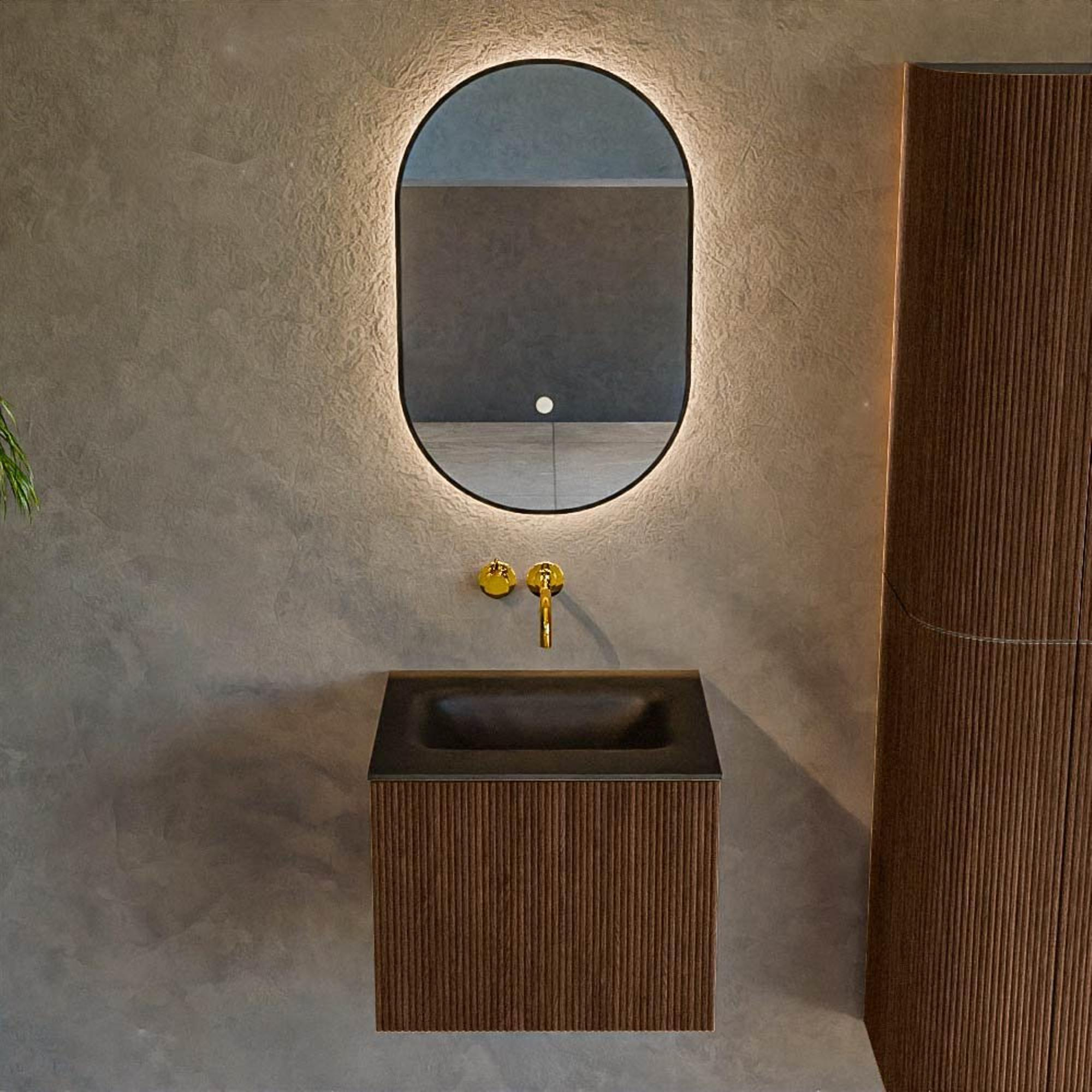 MONDIAZ KURVE 50cm badmeubel kleur Walnut met 1 lade. Wastafel GRUNNE midden zonder kraangat Urban.