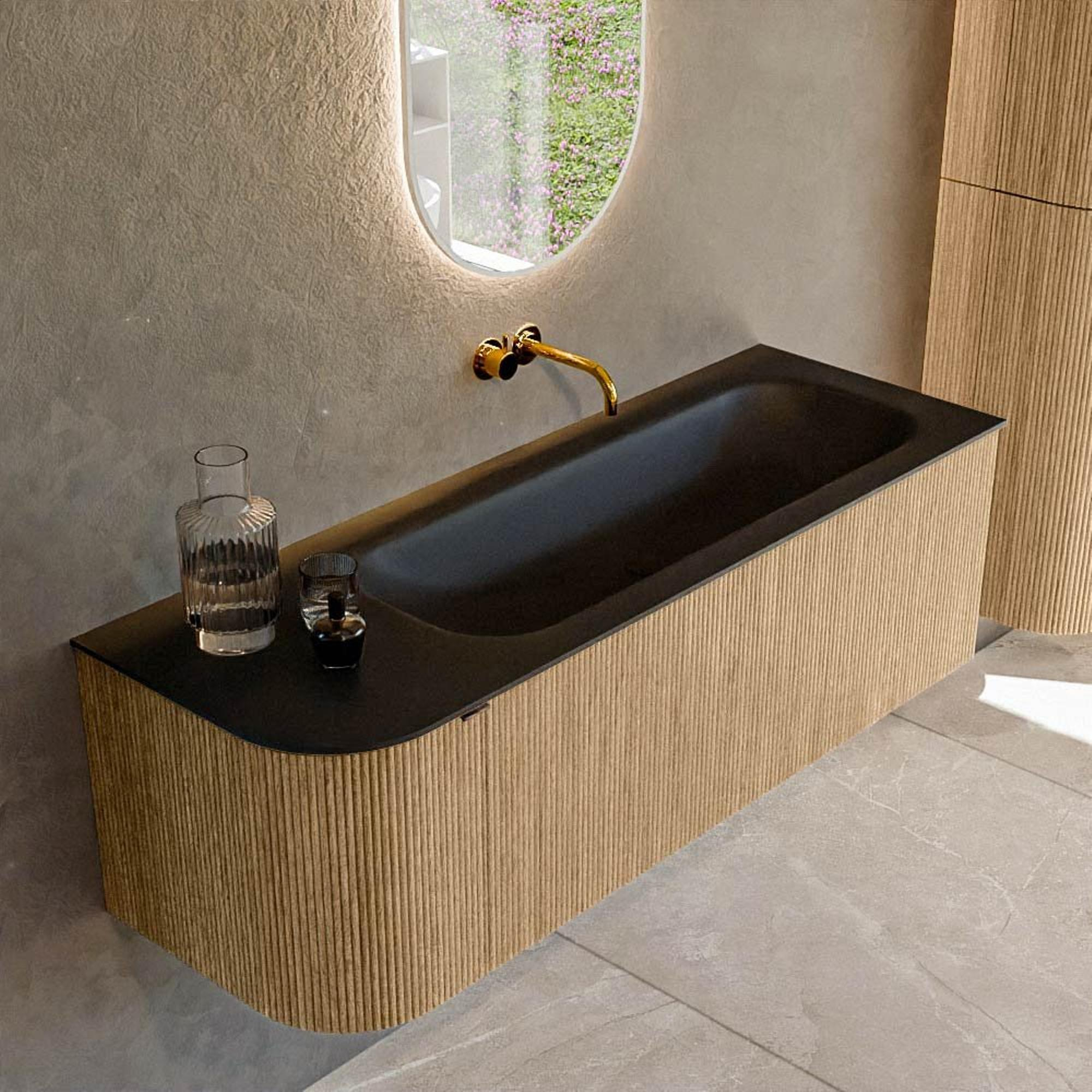 Het ultieme badmeubel dat je badkamer transformeert tot een oase van verfijning. Met zijn halfronde, verticale stroken van massief eiken, verkrijgbaar in de kleuren Oak en Walnut, straalt KURVE vakmanschap uit in elk detail. De zachte rondingen en slim ontworpen deurtjes, elk 40cm hoog, nodigen uit tot gebruik, terwijl de ruimte binnenin optimaal benut wordt dankzij de royale lade van dezelfde hoogte.