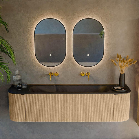 Het ultieme badmeubel dat je badkamer transformeert tot een oase van verfijning. Met zijn halfronde, verticale stroken van massief eiken, verkrijgbaar in de kleuren Oak en Walnut, straalt KURVE vakmanschap uit in elk detail. De zachte rondingen en slim ontworpen deurtjes, elk 40cm hoog, nodigen uit tot gebruik, terwijl de ruimte binnenin optimaal benut wordt dankzij de royale lade van dezelfde hoogte.