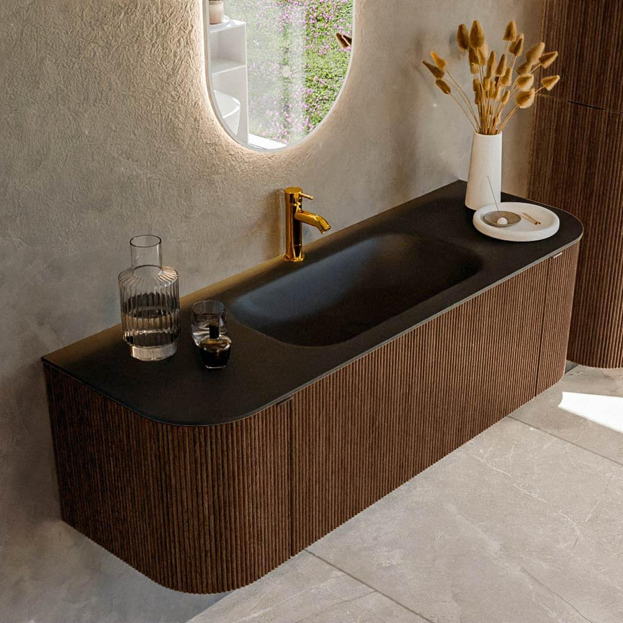Het ultieme badmeubel dat je badkamer transformeert tot een oase van verfijning. Met zijn halfronde, verticale stroken van massief eiken, verkrijgbaar in de kleuren Oak en Walnut, straalt KURVE vakmanschap uit in elk detail. De zachte rondingen en slim ontworpen deurtjes, elk 40cm hoog, nodigen uit tot gebruik, terwijl de ruimte binnenin optimaal benut wordt dankzij de royale lade van dezelfde hoogte.