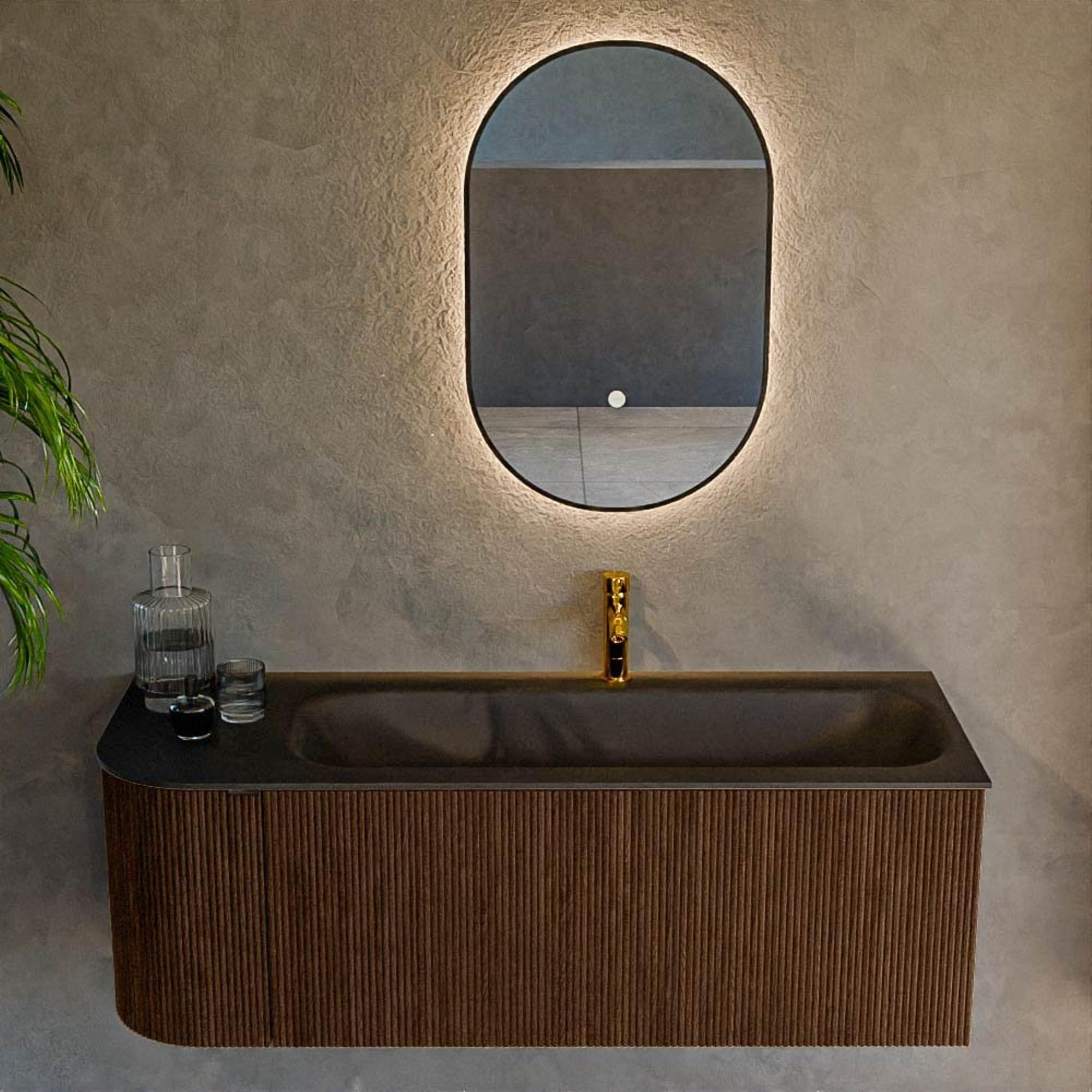 Het ultieme badmeubel dat je badkamer transformeert tot een oase van verfijning. Met zijn halfronde, verticale stroken van massief eiken, verkrijgbaar in de kleuren Oak en Walnut, straalt KURVE vakmanschap uit in elk detail. De zachte rondingen en slim ontworpen deurtjes, elk 40cm hoog, nodigen uit tot gebruik, terwijl de ruimte binnenin optimaal benut wordt dankzij de royale lade van dezelfde hoogte.