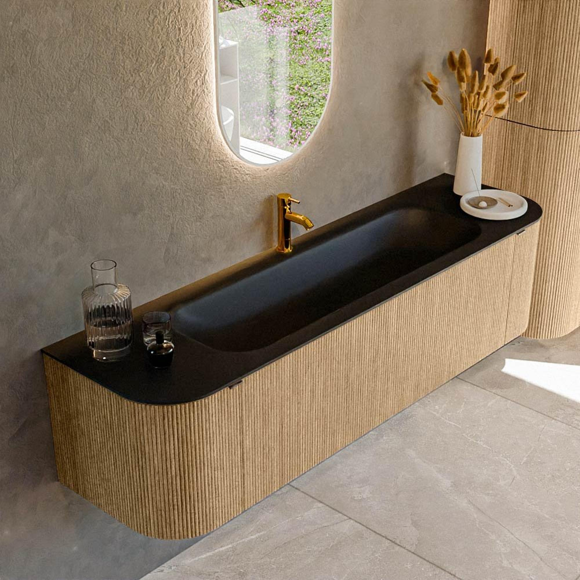 Het ultieme badmeubel dat je badkamer transformeert tot een oase van verfijning. Met zijn halfronde, verticale stroken van massief eiken, verkrijgbaar in de kleuren Oak en Walnut, straalt KURVE vakmanschap uit in elk detail. De zachte rondingen en slim ontworpen deurtjes, elk 40cm hoog, nodigen uit tot gebruik, terwijl de ruimte binnenin optimaal benut wordt dankzij de royale lade van dezelfde hoogte.