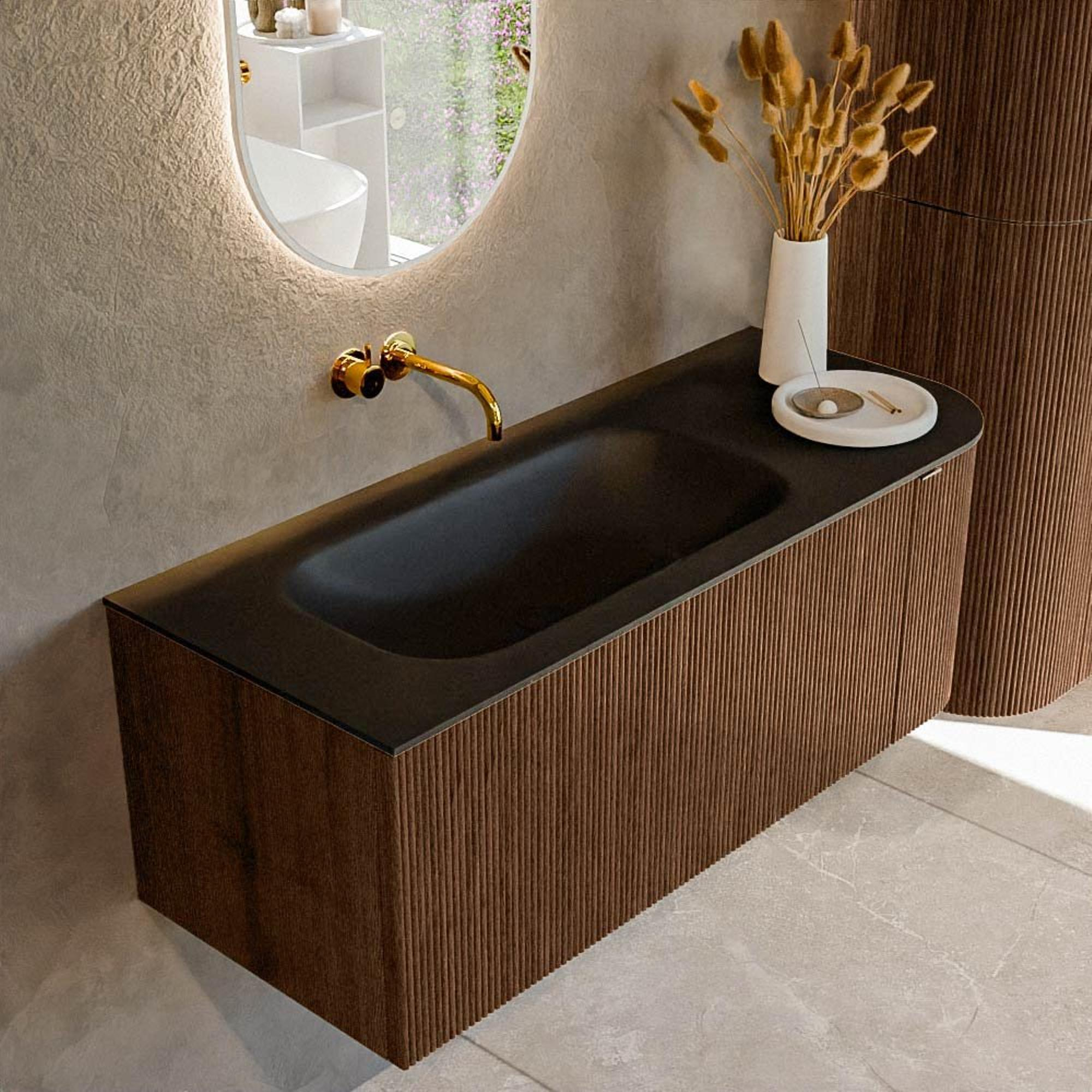 Het ultieme badmeubel dat je badkamer transformeert tot een oase van verfijning. Met zijn halfronde, verticale stroken van massief eiken, verkrijgbaar in de kleuren Oak en Walnut, straalt KURVE vakmanschap uit in elk detail. De zachte rondingen en slim ontworpen deurtjes, elk 40cm hoog, nodigen uit tot gebruik, terwijl de ruimte binnenin optimaal benut wordt dankzij de royale lade van dezelfde hoogte.