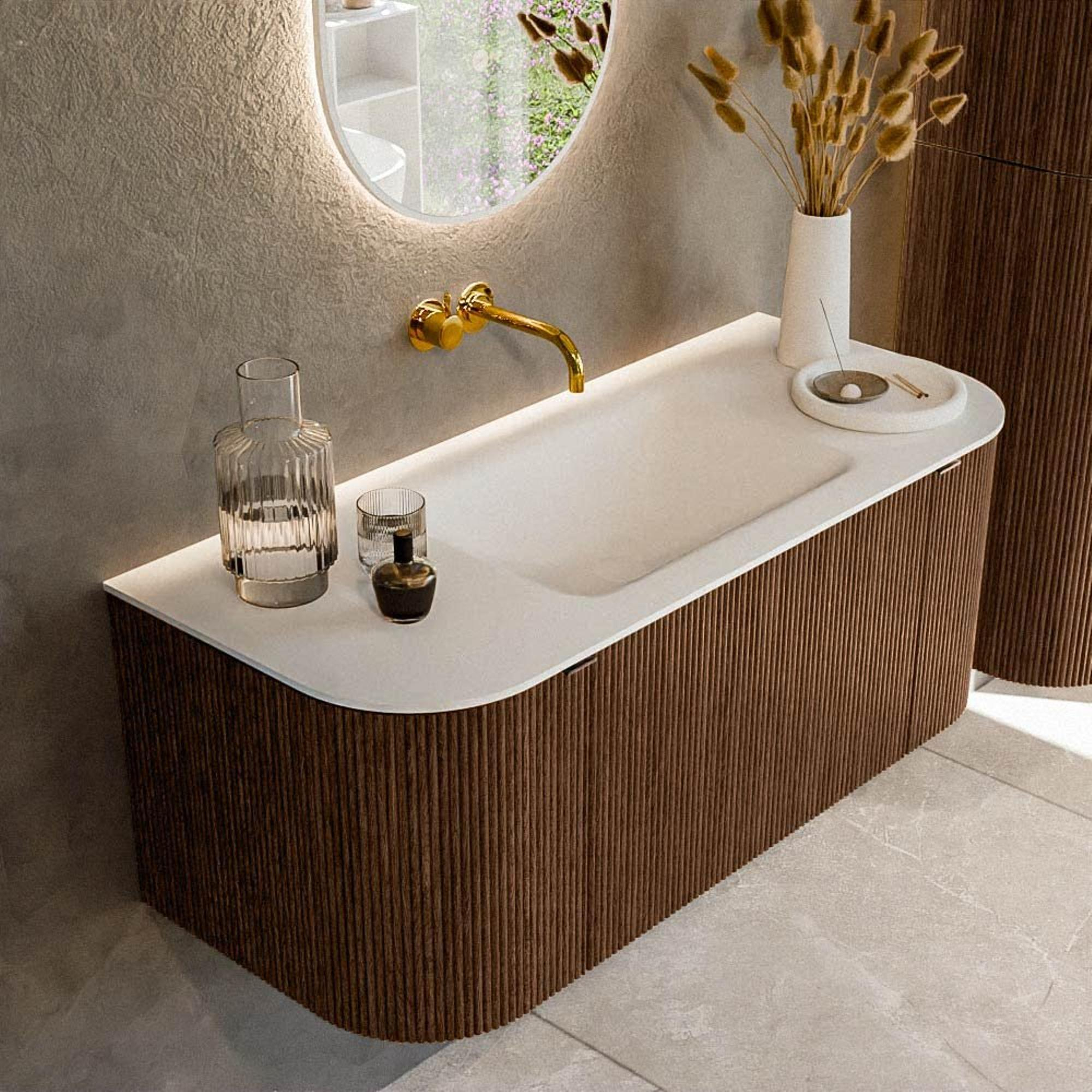 Het ultieme badmeubel dat je badkamer transformeert tot een oase van verfijning. Met zijn halfronde, verticale stroken van massief eiken, verkrijgbaar in de kleuren Oak en Walnut, straalt KURVE vakmanschap uit in elk detail. De zachte rondingen en slim ontworpen deurtjes, elk 40cm hoog, nodigen uit tot gebruik, terwijl de ruimte binnenin optimaal benut wordt dankzij de royale lade van dezelfde hoogte.