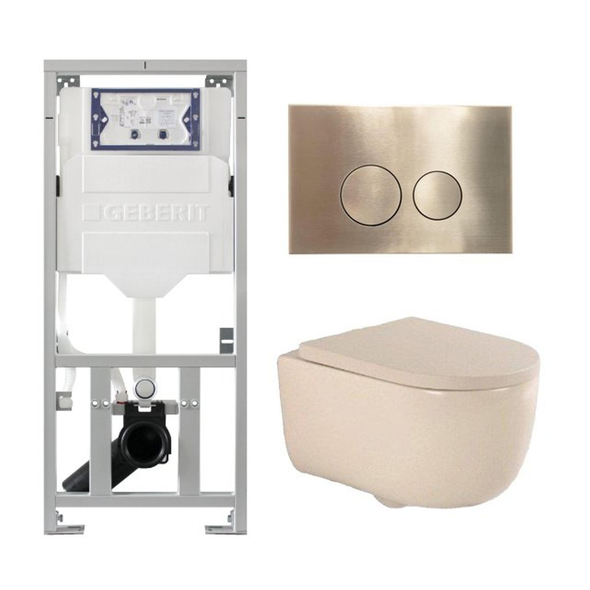 QeramiQ Dely Swirl Toiletset - 36.3x51.7cm - Geberit UP320 inbouwreservoir - 35mm zitting - geborsteld messing bedieningsplaat - ronde knoppen - beige