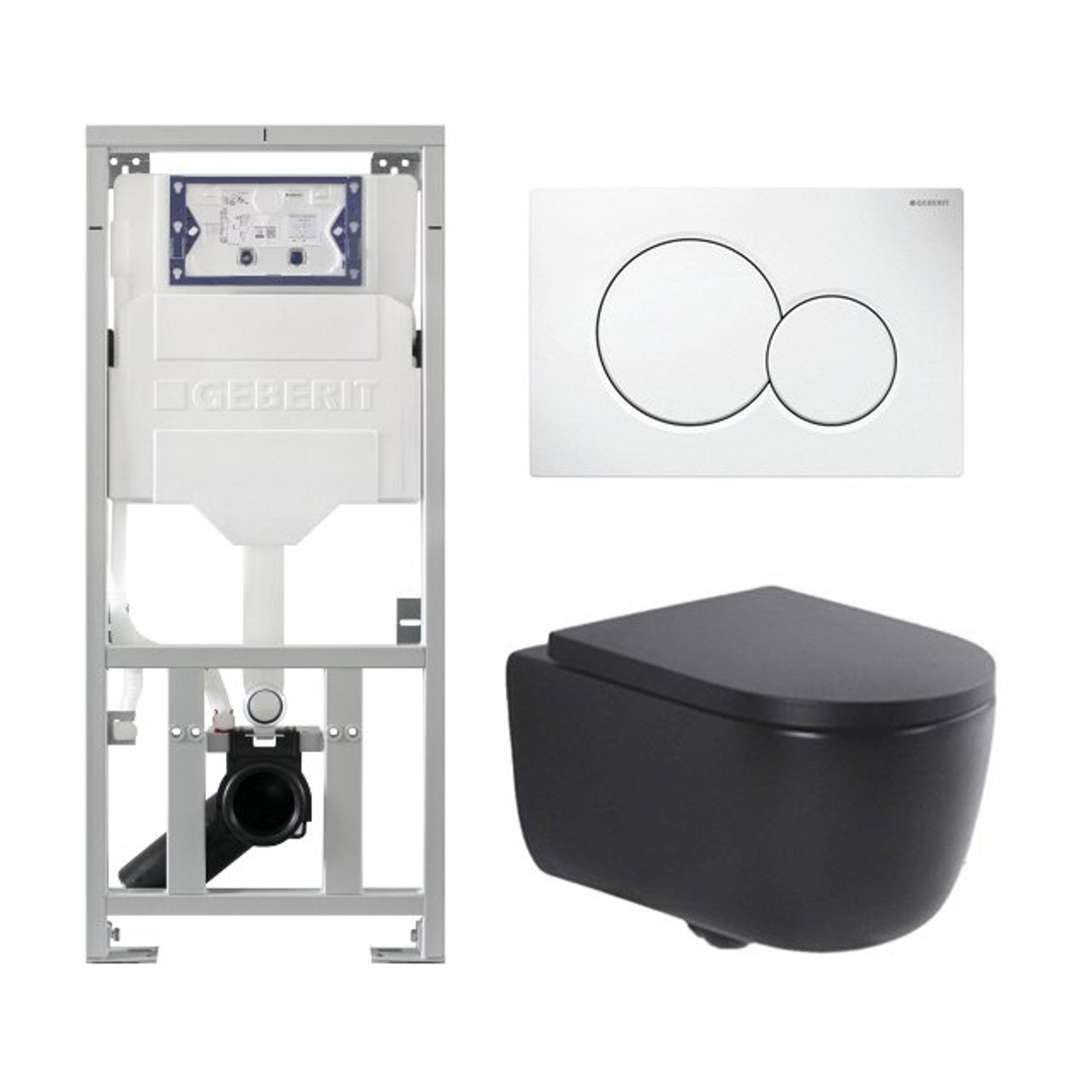 QeramiQ Dely Swirl Toiletset - 36.5x53cm - Geberit UP320 inbouwreservoir - met Burda frame - 35mm zitting - witte sigma bedieningsplaat - ronde knoppen - mat zwart