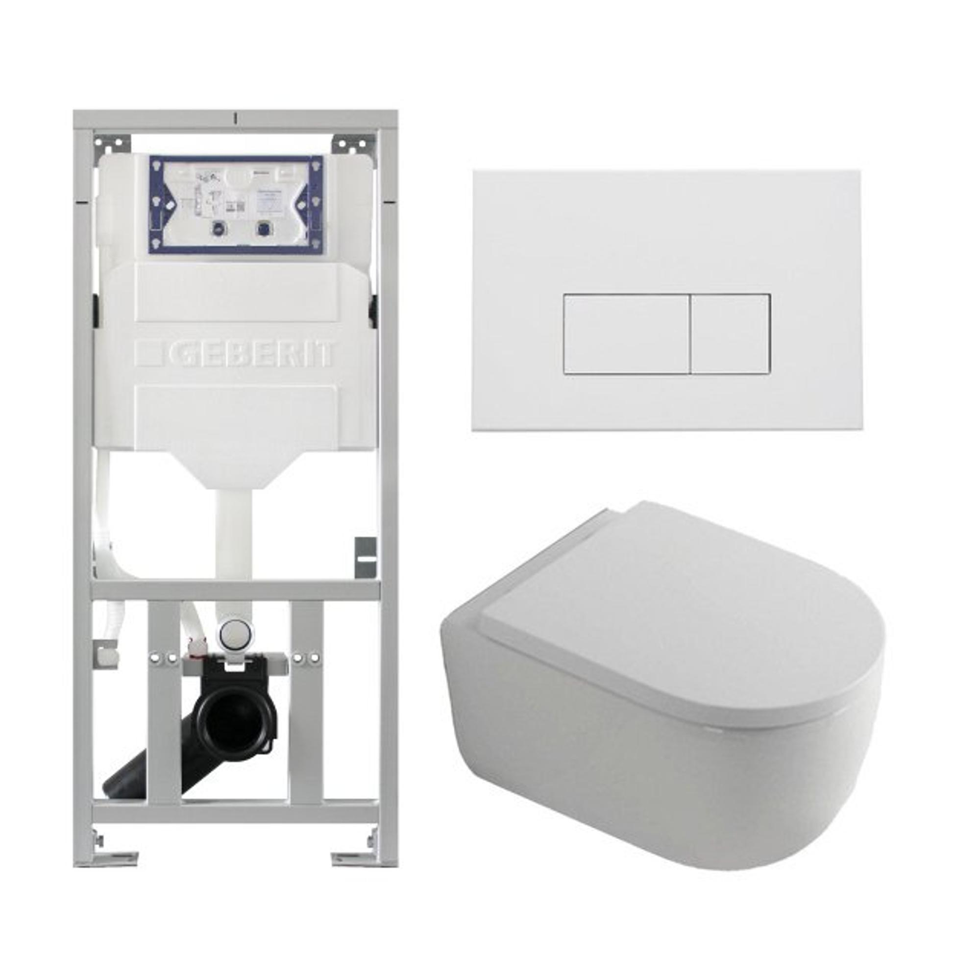 QeramiQ Dely Swirl Toiletset - 36.3x51.7cm - Geberit UP320 inbouwreservoir - met Burda frame - 35mm zitting - mat witte metalen bedieningsplaat - rechthoekige knoppen - wit glans