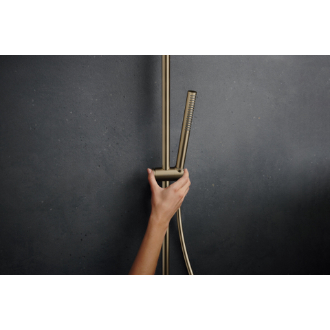 Stap onder deze prachtige regendoucheset en ervaar hoe jouw badkamer verandert in een oase van rust en luxe. De combinatie van een royale hoofddouche met een stijlvolle staafhanddouche zorgt voor een veelzijdige douchebeleving die je elke dag opnieuw verwent. Dankzij het subtiele, brushed bronze design krijgt je badkamer een warme, moderne uitstraling die moeiteloos tijdloos blijft. Het minimalistische karakter van dit systeem geeft je meer ruimte en rust, terwijl de innovatieve technologieën zorgen voor optimaal comfort en gebruiksgemak. Zo geniet je niet alleen van een verfrissende douche, maar ook van een stijlvol en functioneel pronkstuk dat jouw badkamer compleet maakt.
