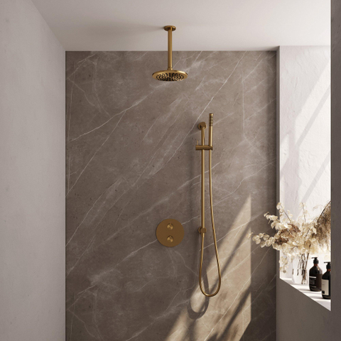 BRAUER Gold Carving thermostatische Inbouw Regendouche - 3-weg - rond - set 89 - 20cm hoofddouche - plafondarm - staaf handdouche - doucheslang - geïntegreerde glijstang - goud geborsteld PVD