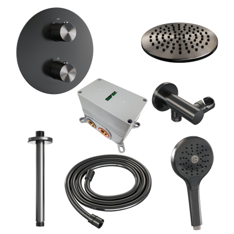 BRAUER Gunmetal Carving thermostatische Inbouw Regendouche - 3-weg - rond - set 83 - 20cm hoofddouche - plafondarm - 3-standen handdouche - doucheslang - wandaansluitbocht - gunmetal geborsteld PVD