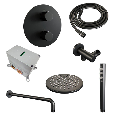 BRAUER Black Edition thermostatische Inbouw Regendouche - 3-weg - rond - set 75 - 20cm hoofddouche - gebogen muurarm - staaf handdouche - doucheslang - wandaansluitbocht - mat zwart