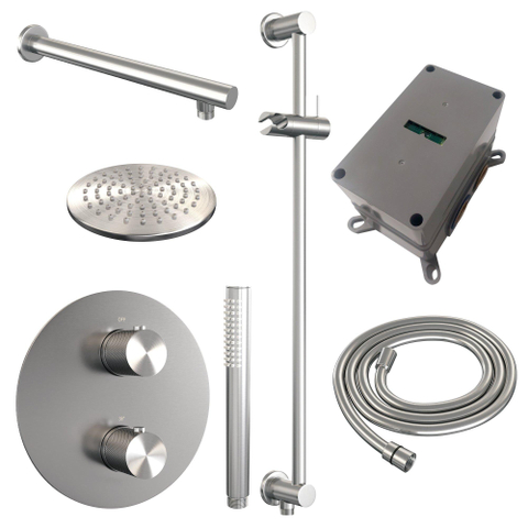 BRAUER Brushed Carving thermostatische Inbouw Regendouche - 3-weg - rond - set 85 - 20cm hoofddouche - rechte muurarm - staaf handdouche - doucheslang - geïntegreerde glijstang - RVS geborsteld PVD