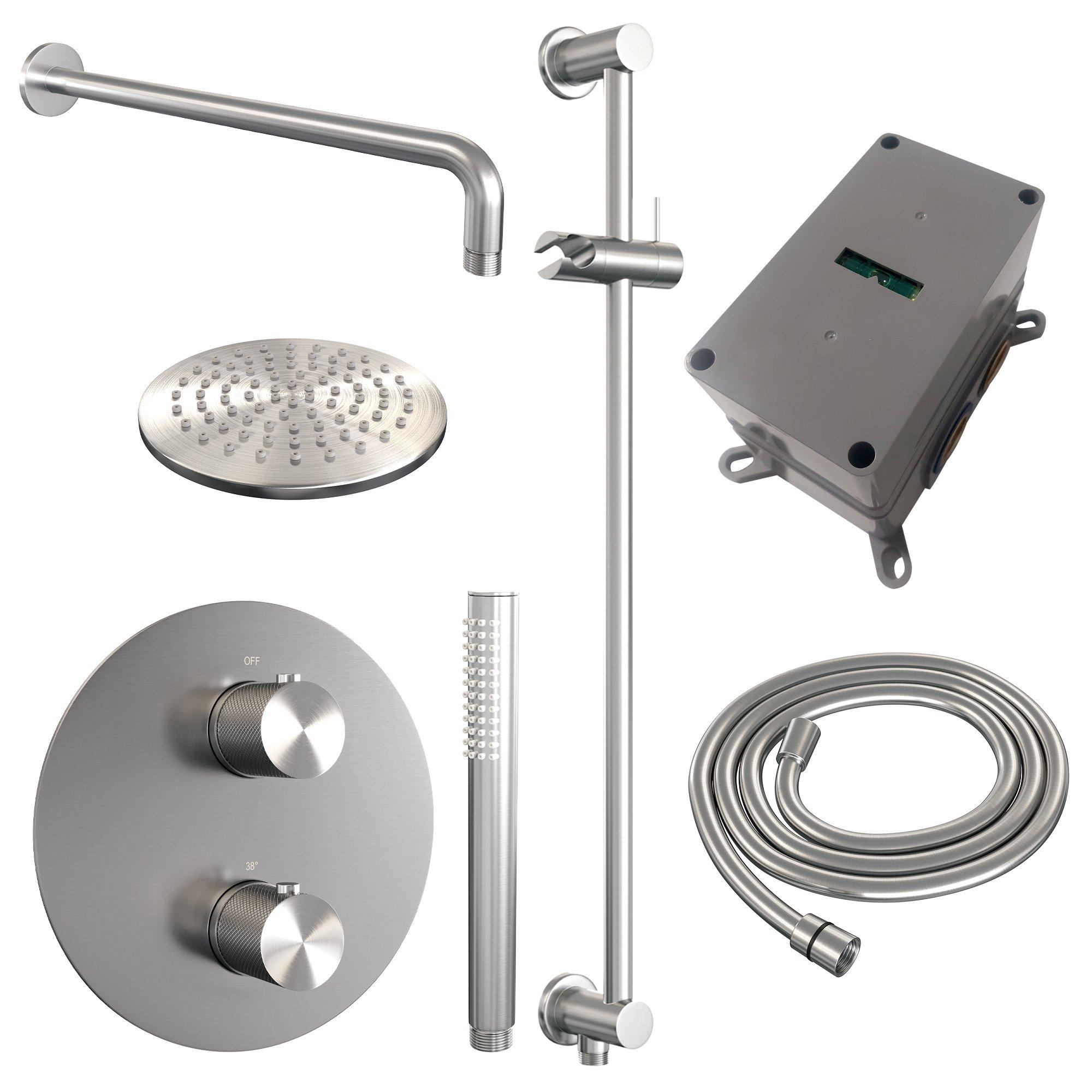 BRAUER Brushed Carving thermostatische Inbouw Regendouche - 3-weg - rond - set 87 - 20cm hoofddouche - gebogen muurarm - staaf handdouche - doucheslang - geïntegreerde glijstang - RVS geborsteld PVD