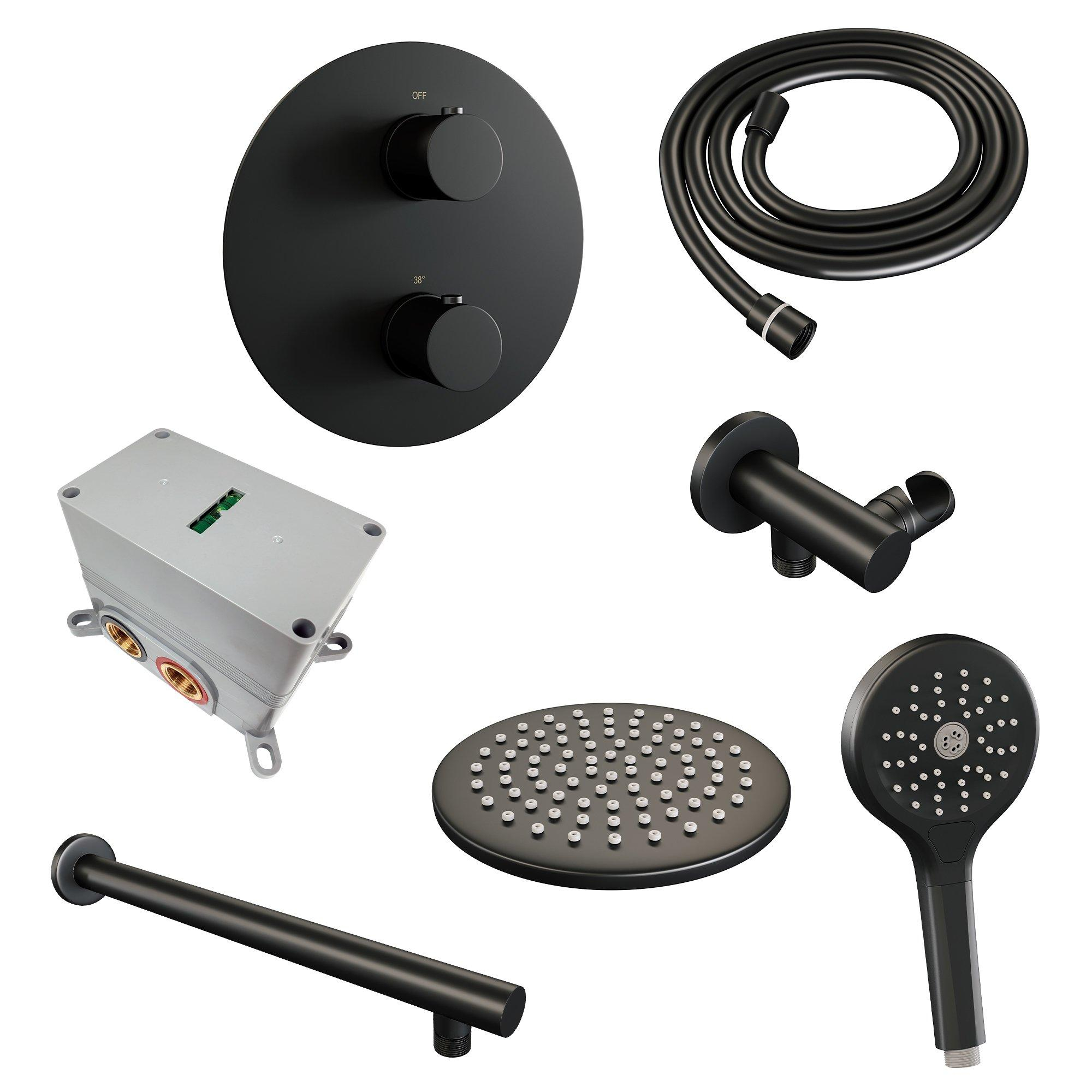 BRAUER Black Edition thermostatische Inbouw Regendouche - 3-weg - rond - set 79 - 20cm hoofddouche - rechte muurarm - 3-standen handdouche - doucheslang - wandaansluitbocht - mat zwart
