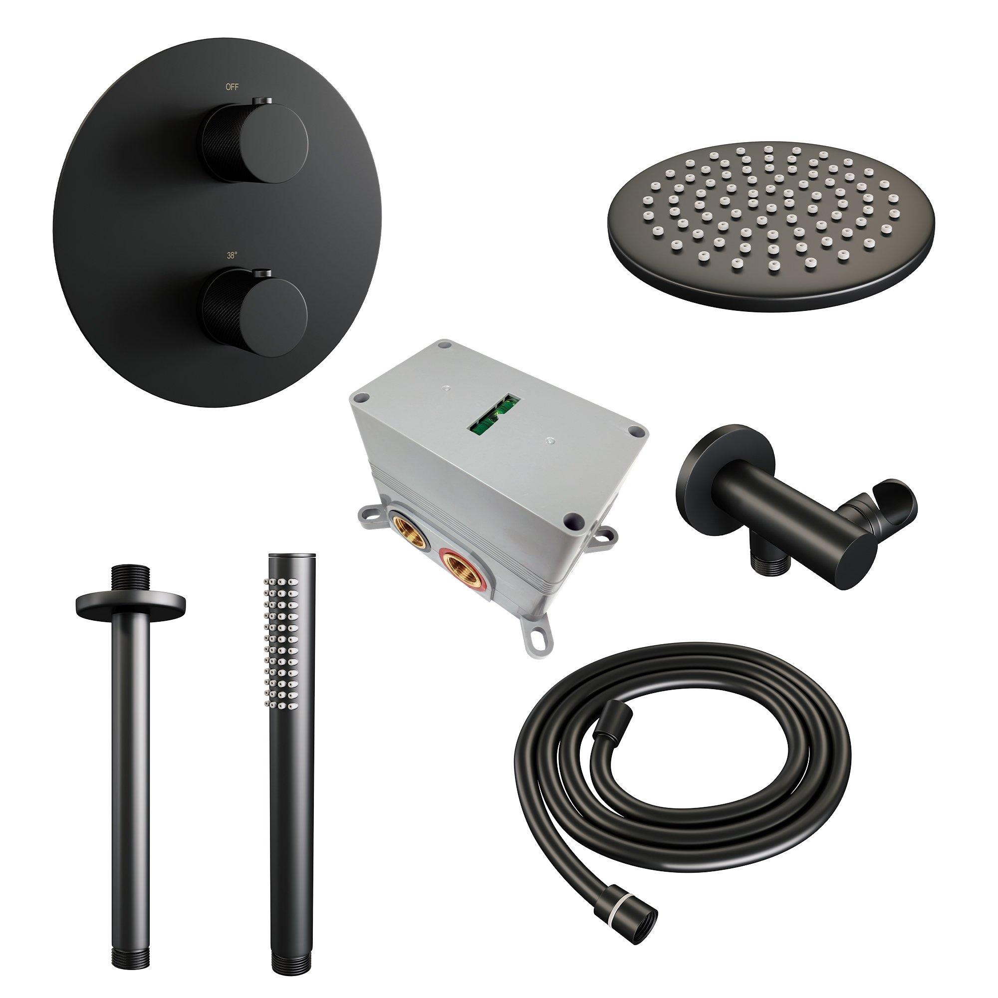 BRAUER Black Carving thermostatische Inbouw Regendouche - 3-weg - rond - set 77 - 20cm hoofddouche - plafondarm - staaf handdouche - doucheslang - wandaansluitbocht - mat zwart