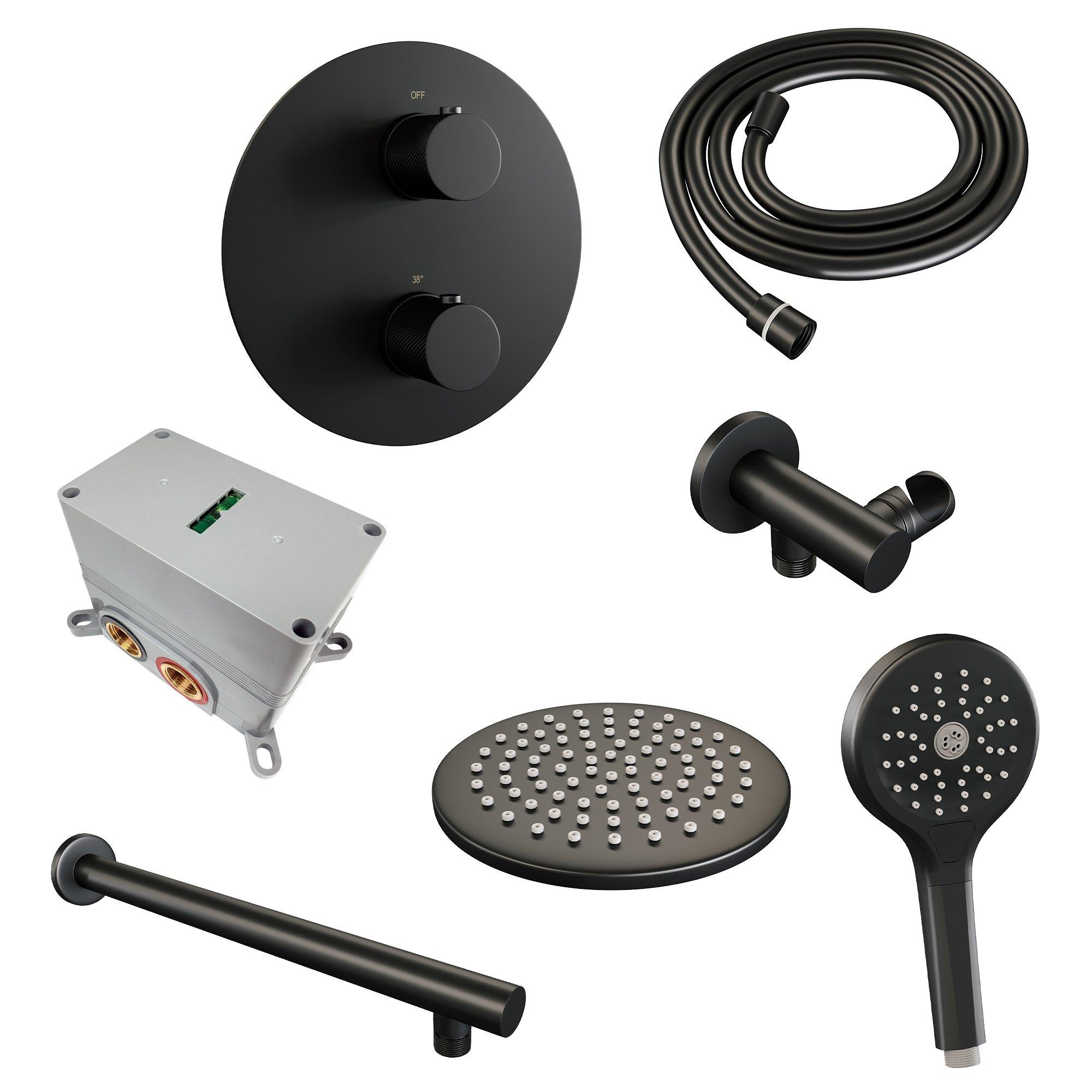 BRAUER Black Carving thermostatische Inbouw Regendouche - 3-weg - rond - set 79 - 20cm hoofddouche - rechte muurarm - 3-standen handdouche - doucheslang - wandaansluitbocht - mat zwart