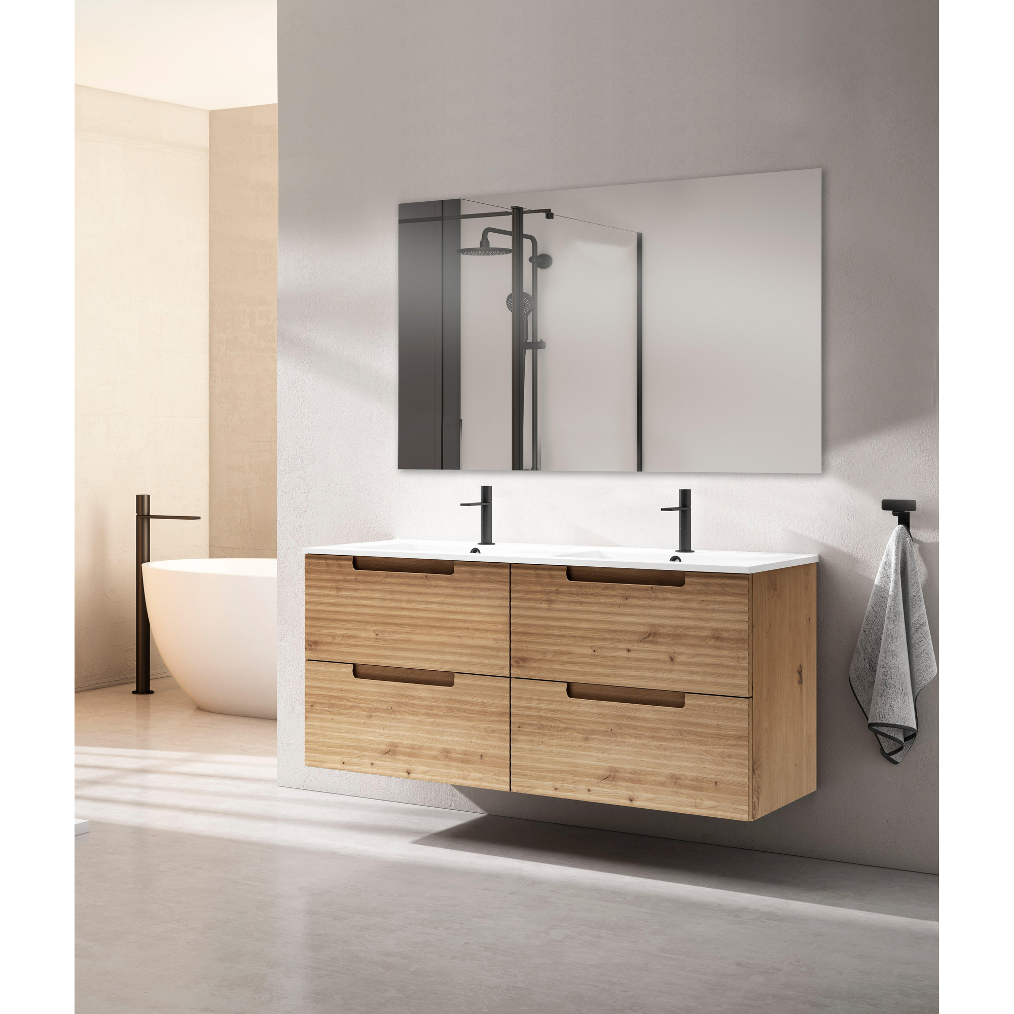 Stel je voor: een badkamer die niet alleen functioneel is, maar ook warmte en karakter uitstraalt. Deze meubelset transformeert jouw badkamer in een stijlvolle en rustgevende ruimte waar je elke dag met plezier begint en eindigt. Dankzij de combinatie van rustiek eiken en strakke, witte keramische wasbakken ontstaat een harmonieus geheel dat zowel modern als tijdloos oogt. Met voldoende opbergruimte en slimme details biedt deze set niet alleen een prachtige uitstraling, maar ook praktische oplossingen om jouw badkamer netjes en georganiseerd te houden. De rechthoekige spiegel zorgt voor een extra gevoel van ruimte en licht, waardoor je badkamer nog uitnodigender wordt. Dit meubelstuk is ontworpen om jouw badkamer te verrijken met een luxe uitstraling en een comfortabele gebruikservaring, zodat je elke ochtend en avond geniet van een moment voor jezelf in een sfeervolle omgeving.