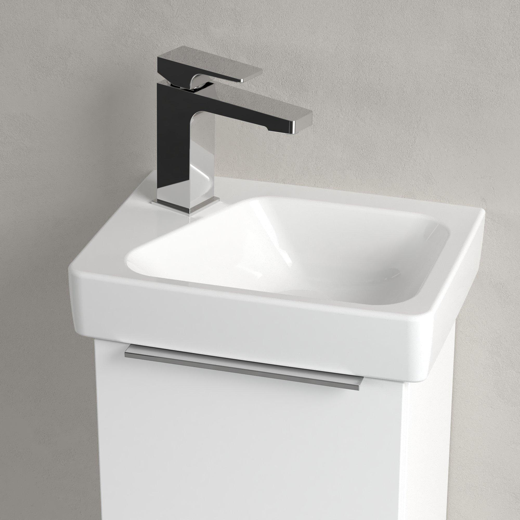 - Rechthoekig ontwerp met waskom aan de rechterkant voor een logische en ruimtebesparende indeling.