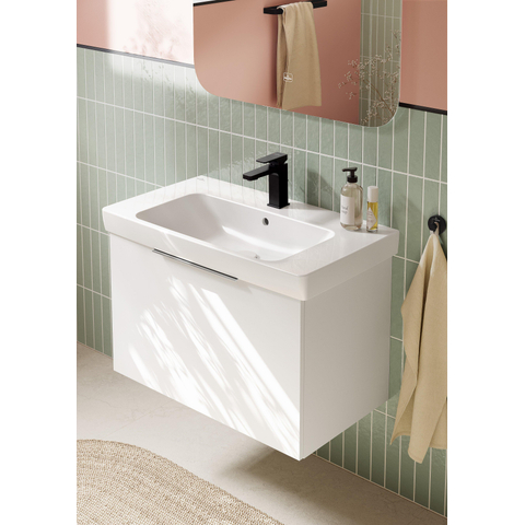De rechthoekige vorm met rechte hoeken en de glanzend witte kleur geven deze wastafel een rustige, architectonische uitstraling die makkelijk te combineren is met vrijwel iedere badkamerstijl. De smalle randen en het heldere lijnenspel zorgen voor een moderne look zonder dat het geheel te hard oogt. Door het centraal geplaatste kraangat blijft de vorm symmetrisch en gebalanceerd, wat direct bijdraagt aan een opgeruimd gevoel in je badkamer. De kleur wit alpine is een zuivere, frisse wittint die prachtig matcht met witte of gekleurde tegels, zwarte kranen of juist klassiek chroom. Zo kun je met je keuze voor kraan, accessoires en onderkast eenvoudig de sfeer bepalen: van hotel-chic tot strak en Scandinavisch.