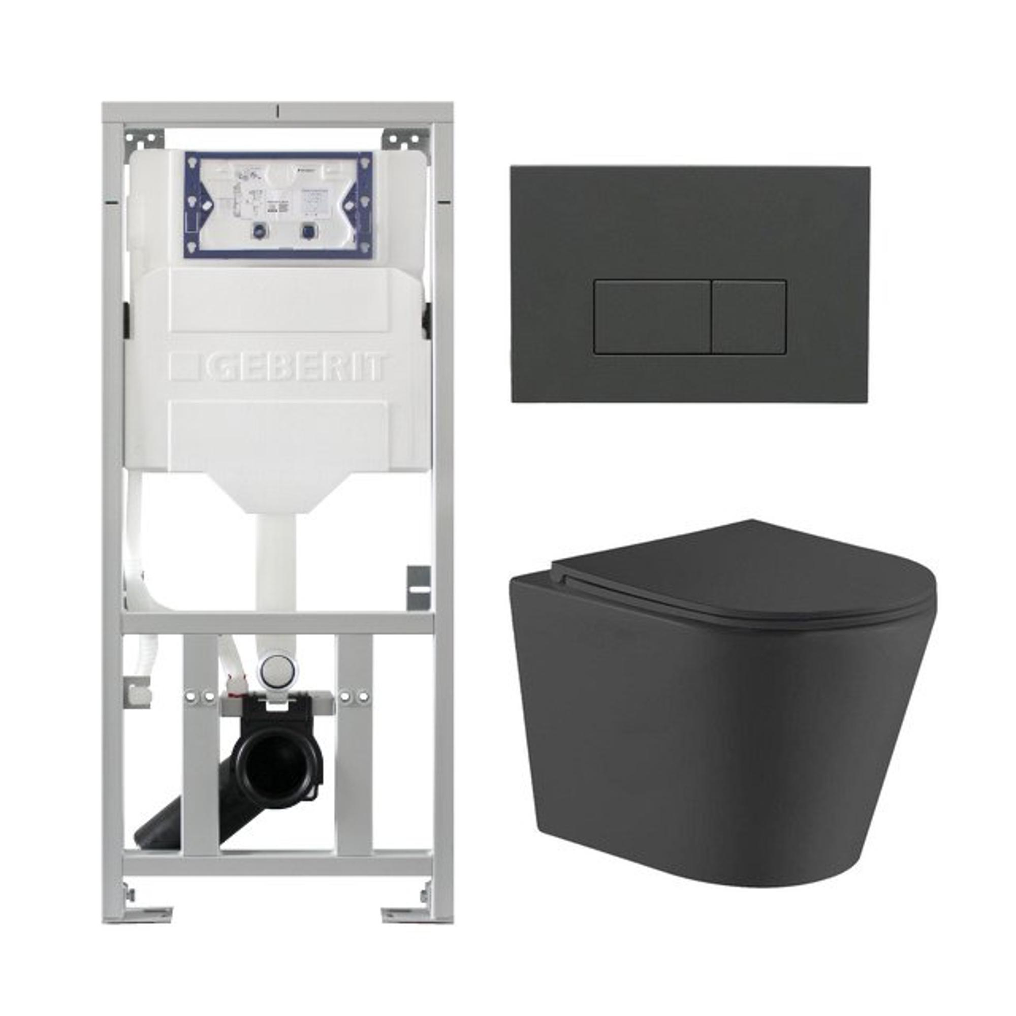 QeramiQ Dely Toiletset - 36.3x51.7cm - diepspoel - rimless - Geberit UP320 inbouwreservoir - softclose toiletzitting - antraciet mat bedieningsplaat - rechtehoekige knoppen - mat zwart
