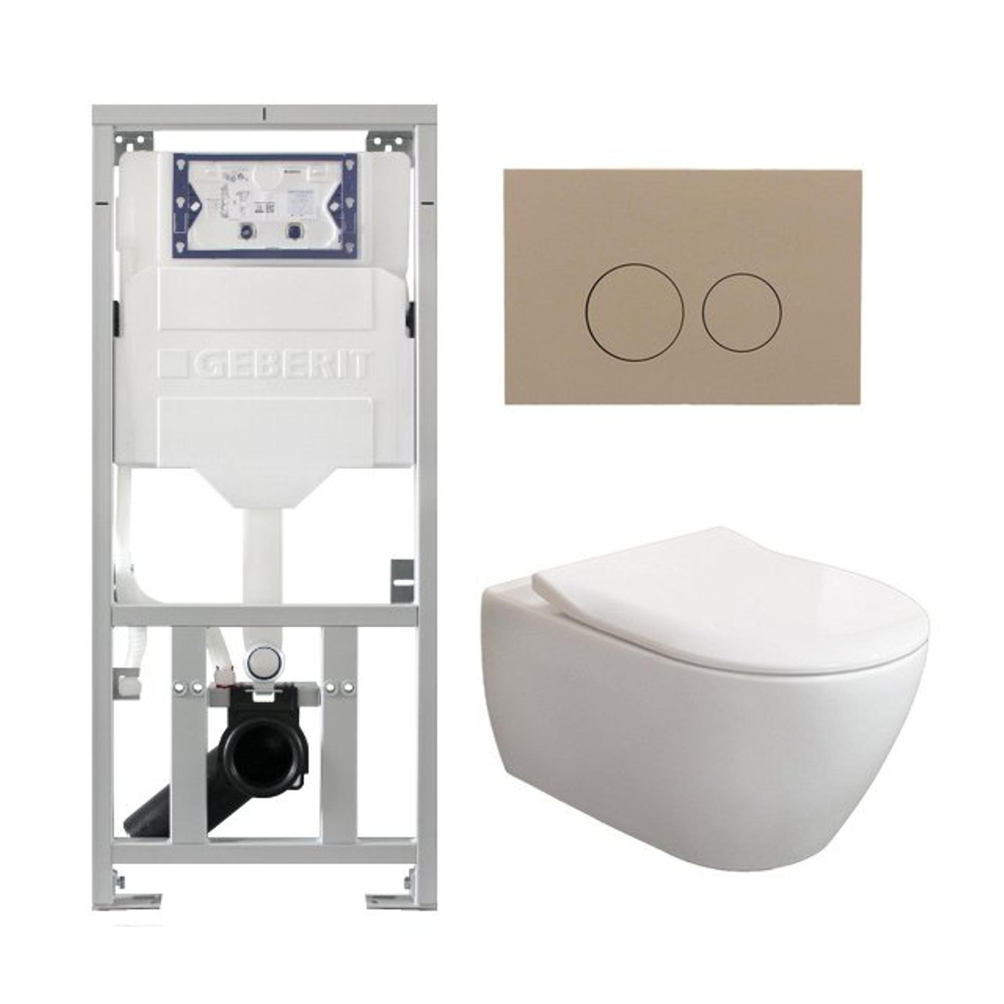 Villeroy & Boch Subway 2.0 DirectFlush CeramicPlus toiletset slimseat zitting met Geberit reservoir en taupe bedieningsplaat met ronde knoppen wit