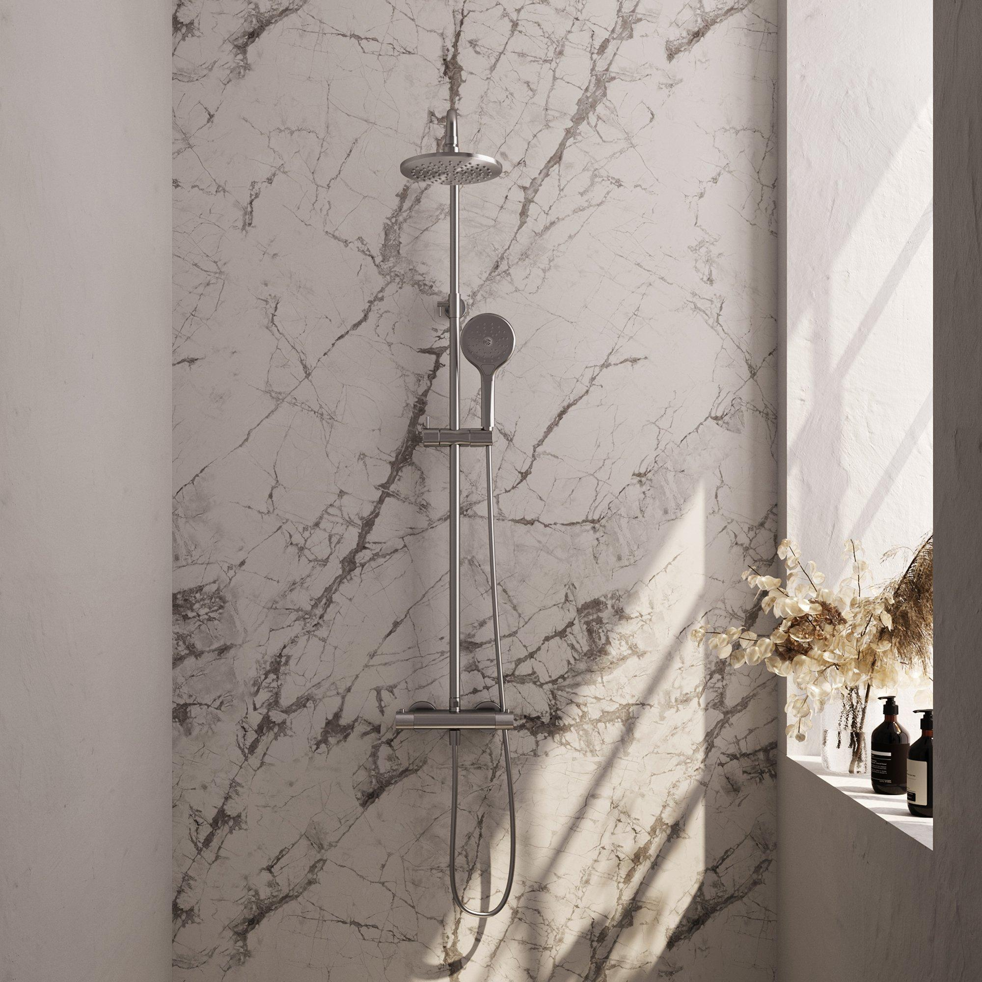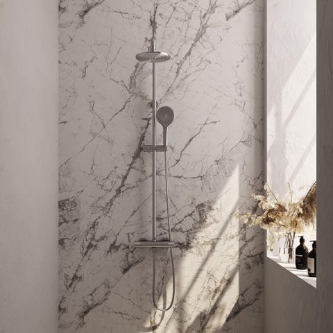 De Brauer Brushed Carving Regendoucheset opbouw is een prachtige toevoeging aan elke badkamer. Met zijn elegante ontwerp en hoogwaardige materialen, brengt deze doucheset een gevoel van luxe en comfort in jouw dagelijkse routine. Geniet van een ontspannende douche-ervaring met de hoofddouche van 20cm, de verstelbare glijstang, de handdouche met 3 standen en de unieke carving knoppen. De PVD-afwerking en het geborsteld roestvrij staal geven deze set een moderne uitstraling die perfect past bij elke badkamerstijl.