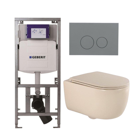 QeramiQ Dely Swirl Toiletset - 36.3x51.7cm - Geberit UP320 inbouwreservoir - met Burda frame - slim zitting - bedieningsplaat licht grijs - ronde knoppen - beige