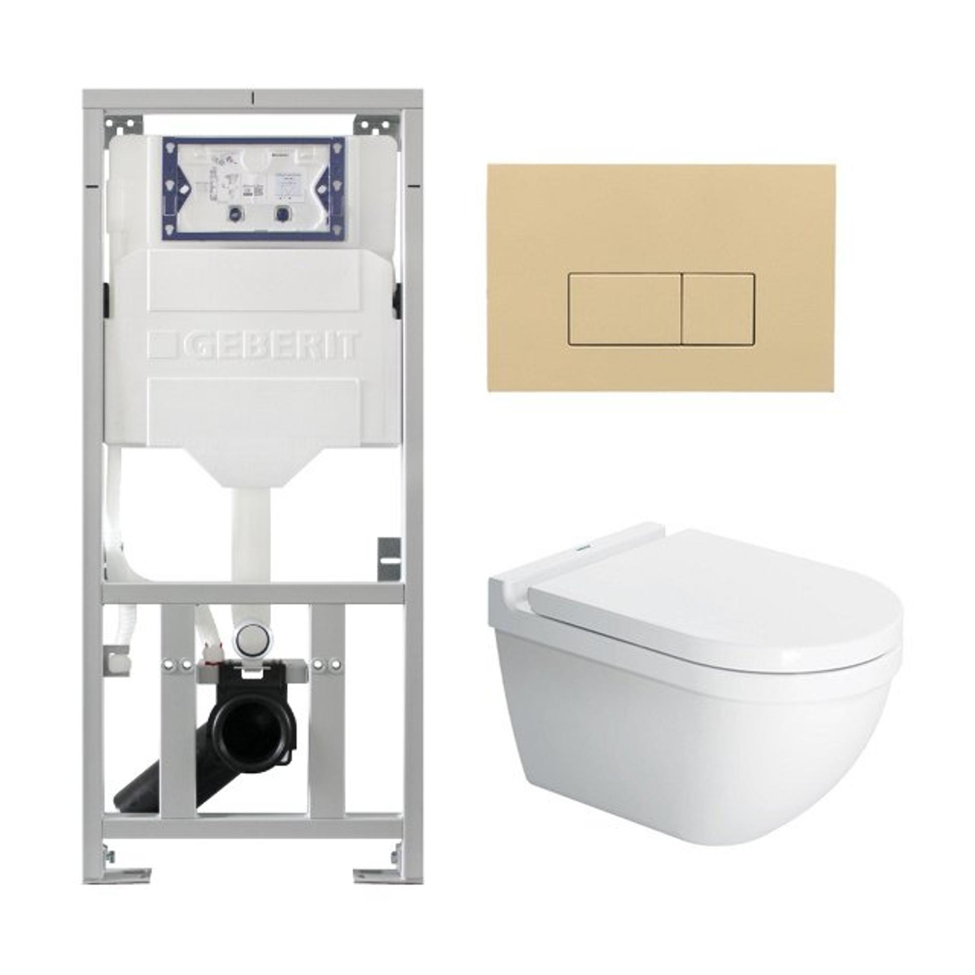 Duravit Starck 3 toiletset met Geberit inbouwreservoir toiletzitting met Saniclass softclose zitting en QeramiQ beige bedieningsplaat met rechthoekige knoppen wit