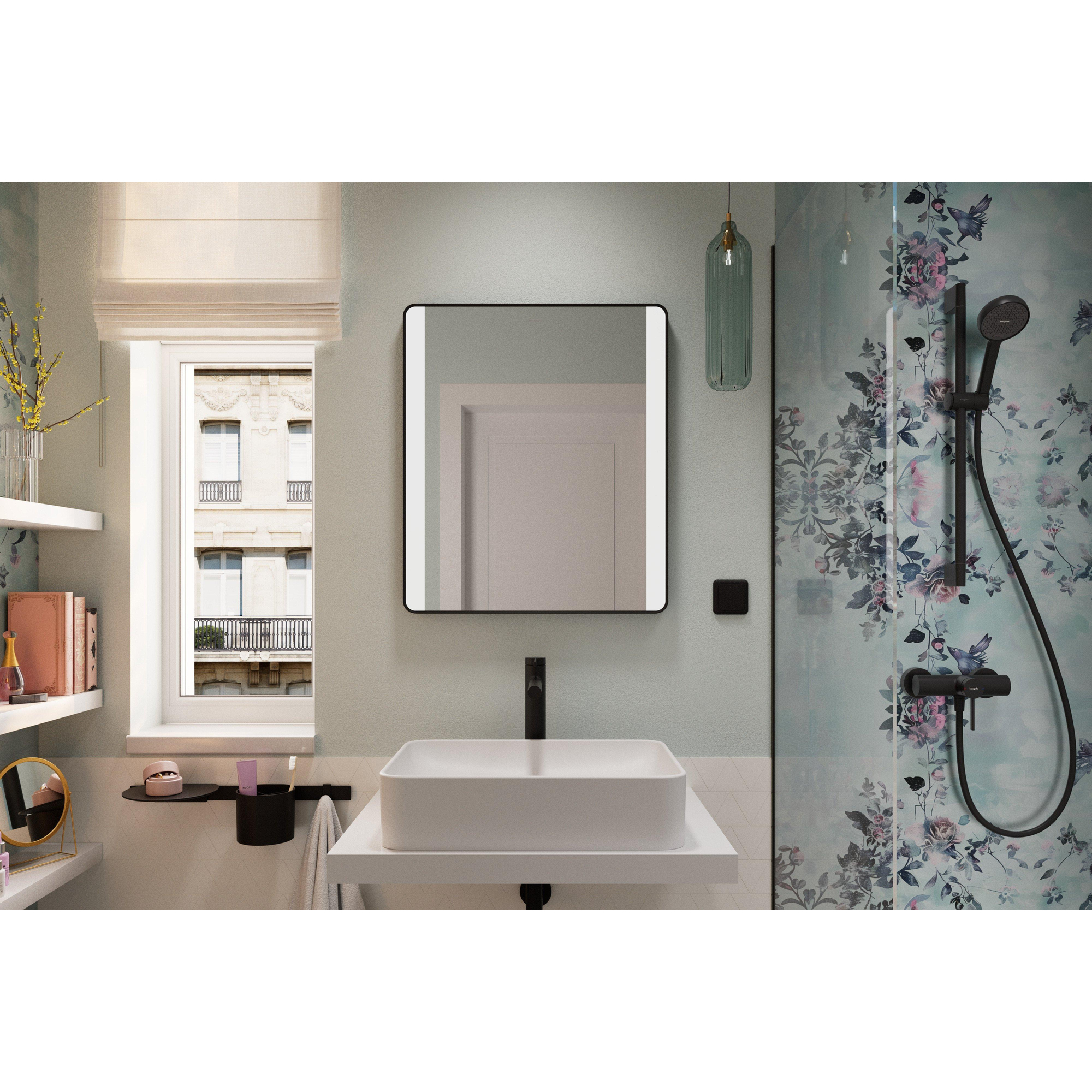 Met de Hansgrohe Xarita Lite Q Spiegel - 60x70cm - led verlichting - Verticaal - wandschakelaar - Zwart mat haal je een stijlvolle en functionele badkamerspiegel in huis die perfect past in een moderne, industriële of minimalistische badkamer. Deze rechthoekige wandspiegel met geïntegreerde verlichting zorgt voor helder licht bij het wassen, scheren of opmaken. Dankzij de matte zwarte lijst vormt de spiegel een krachtig accent bij je wastafel, in combinatie met je wastafelkraan en badkamermeubel. Zoek je een praktische lichtspiegel met een rustige uitstraling en een gebruiksvriendelijke bediening? Dan is deze verlichte badkamerspiegel een slimme keuze.
