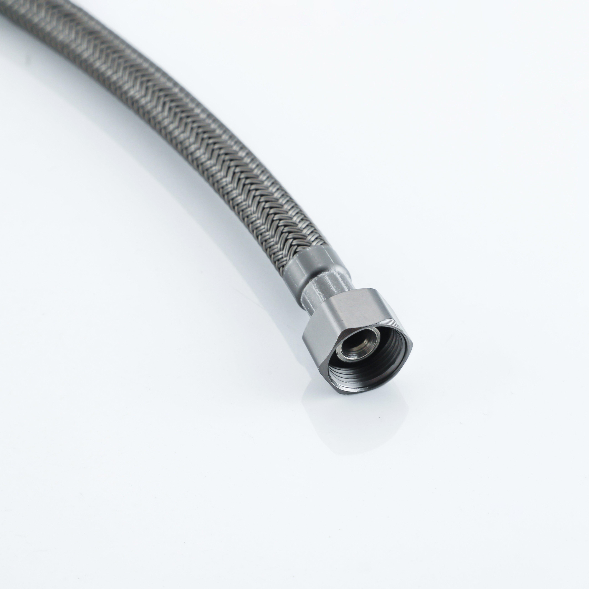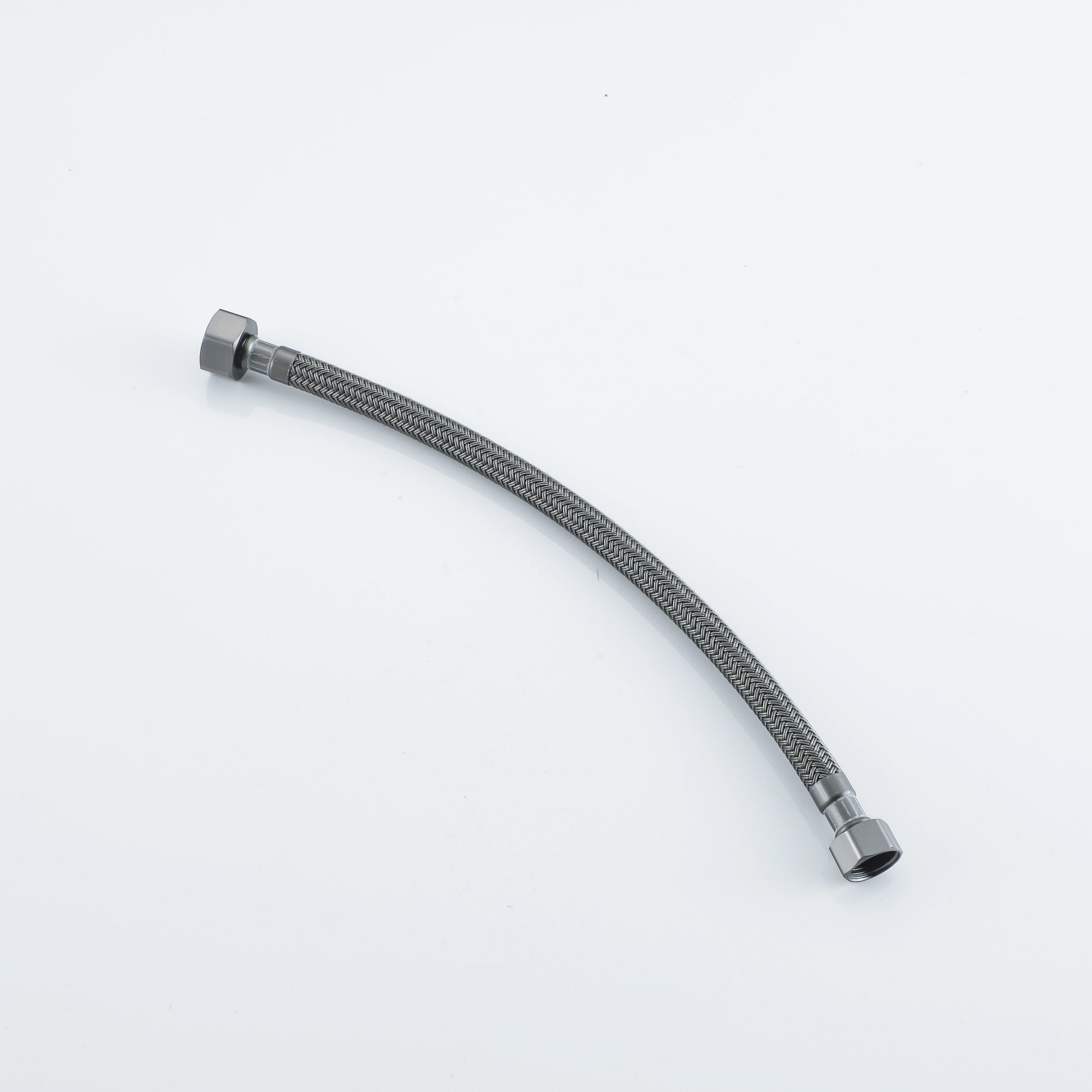 De Fortifura Calvi flexibele slang van 30 cm in geborsteld gunmetal is een stijlvolle en functionele oplossing voor het aansluiten van sanitair zoals een kraan, boiler of toilet. Deze flexibele slang is perfect geschikt voor binnenshuis gebruik en biedt een betrouwbare verbinding tussen de waterleiding en bijvoorbeeld de kraan in je wasbak. Met zijn unieke geborsteld gunmetal afwerking voegt de slang een luxe uitstraling toe aan je badkamer of keuken.De slang heeft een lengte van 30 cm en is voorzien van een 3/8" binnendraad aan de ene kant en een 1/2" binnendraad (ook bekend als halfduims) aan de andere kant. Deze standaard aansluitingen maken het gemakkelijk om de slang te installeren op verschillende soorten sanitair, zonder dat je je zorgen hoeft te maken over lekken of losse verbindingen.