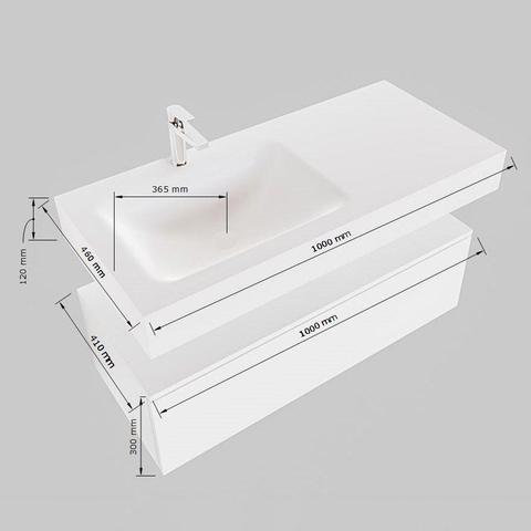 De 1 lade van dit badmeubel biedt voldoende ruimte om al uw badkamerbenodigdheden georganiseerd te houden. De vrijhangende wastafel aan de linkerkant zorgt voor een ruim werkblad en creëert een gevoel van ruimte in de badkamer. De afwezigheid van een kraangat geeft u de vrijheid om een kraan naar keuze toe te voegen, waardoor u uw eigen unieke stijl kunt creëren.