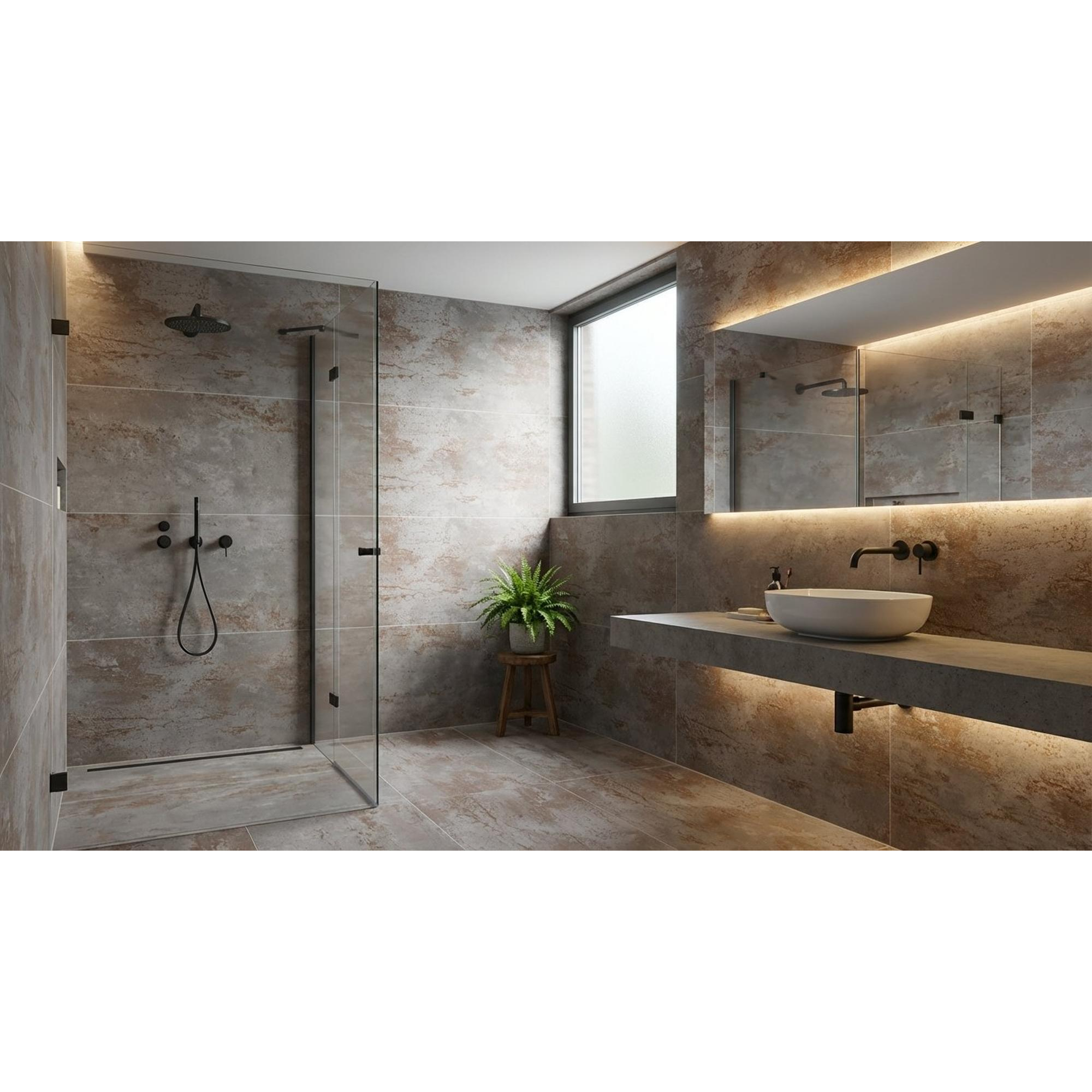 De uitstraling van deze tegel is geïnspireerd op verouderd metaal en subtiele betonstructuren. Dat zorgt voor een karaktervolle look, zonder dat de ruimte donker of druk aanvoelt. De zilvergrijze kleur met matte afwerking sluit perfect aan bij populaire badkamertrends als industrieel, modern en urban chic. Leg je hem door op wand én vloer, dan creëer je een luxe wellnessgevoel met een zeer ingetogen, stijlvolle basis. Dankzij het grote formaat 60x120 cm heb je bovendien minder voegen, wat de ruimte strakker en rustiger laat ogen en je interieur direct een hoogwaardige, bijna hotelachtige uitstraling geeft.