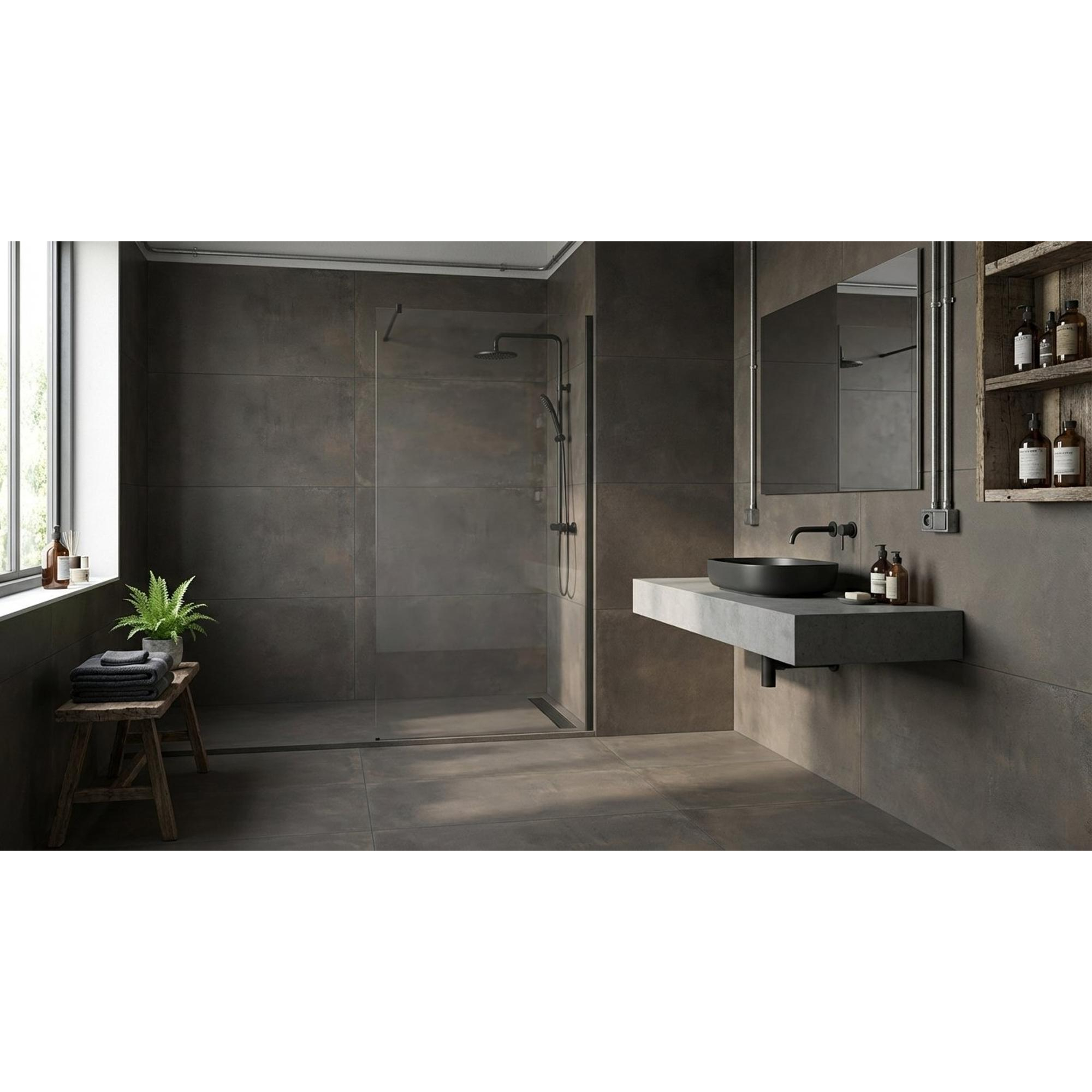 Deze tegel combineert de robuuste uitstraling van metaal met de warmte van brons en de rust van een matte betonlook. De subtiele kleurnuances en lichte schakeringen in het oppervlak geven je badkamer diepte en karakter, zonder dat het onrustig oogt. Zeker in combinatie met zwarte kranen, houten meubels of strakke witte sanitairproducten ontstaat een stijlvol contrast dat direct doet denken aan luxe hotelbadkamers. Het langgerekte formaat van 60x120 cm laat patronen vloeiend doorlopen en zorgt voor een exclusieve, bijna architectonische uitstraling. Wil je één statementwand achter je bad of douche, of juist een doorlopende vloer in de hele ruimte? Met dit formaat kun je alle kanten op.