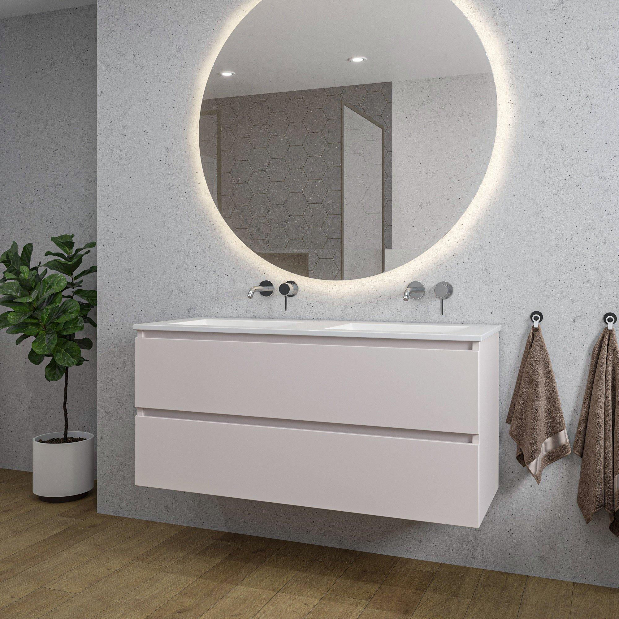 Saniclass Chaci Badkamermeubelset - 120x46x57cm - keramische wastafel wit - 2 wasbakken - zonder kraangaten - 2 lades - ronde spiegel met verlichting - mat cotton (beige)