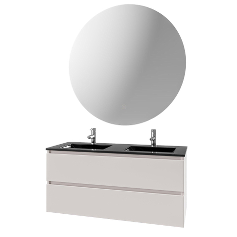 Saniclass Chaci Badkamermeubelset - 120x46x55cm - keramische wastafel zwart - 2 wasbakken - 2 kraangaten - 2 lades - ronde spiegel met verlichting - mat cotton (beige)